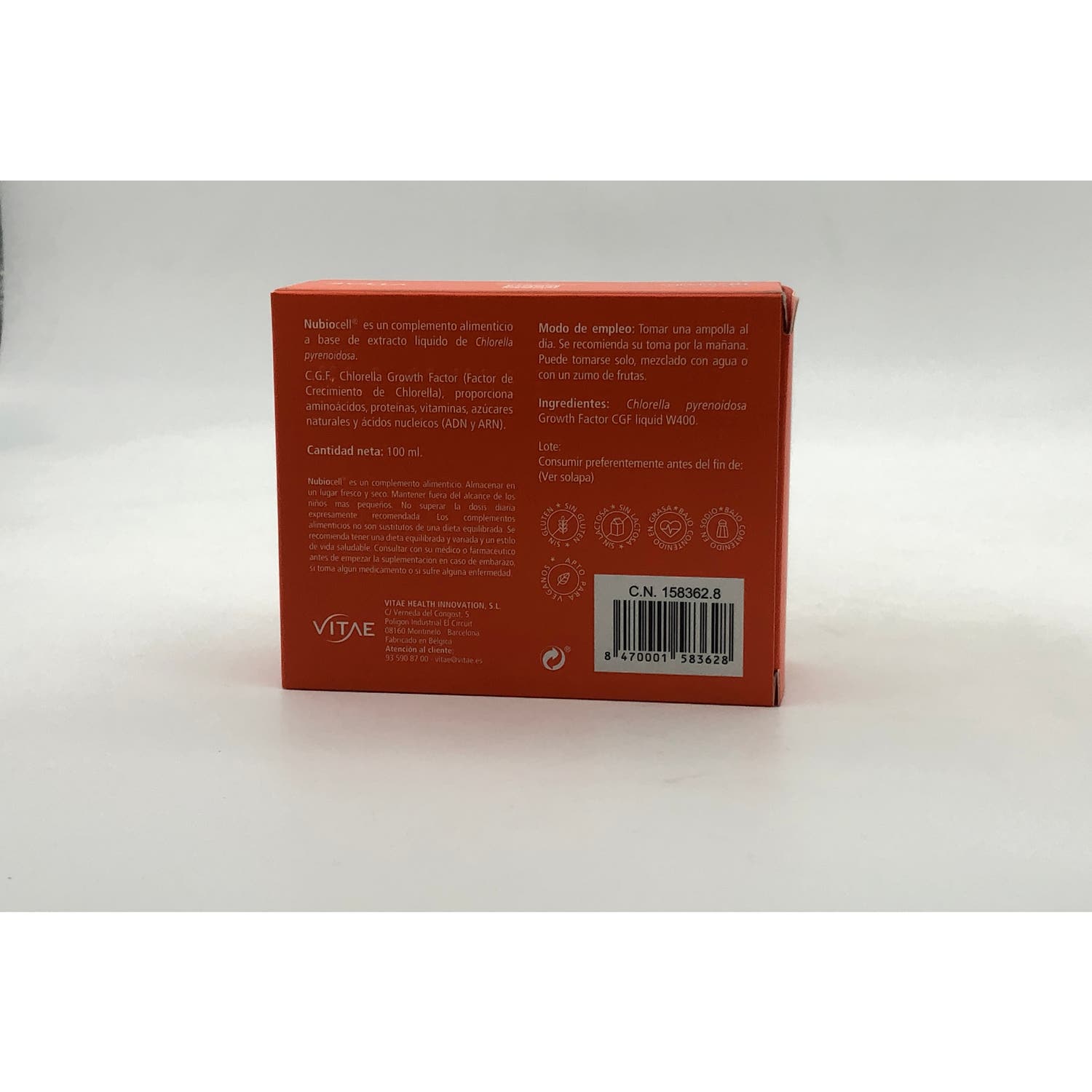 Vitae Nubiocell 10 ampollas es un suplemento elaborado a partir de un extracto líquido de microalga de Chlorella pyrenoidosa.