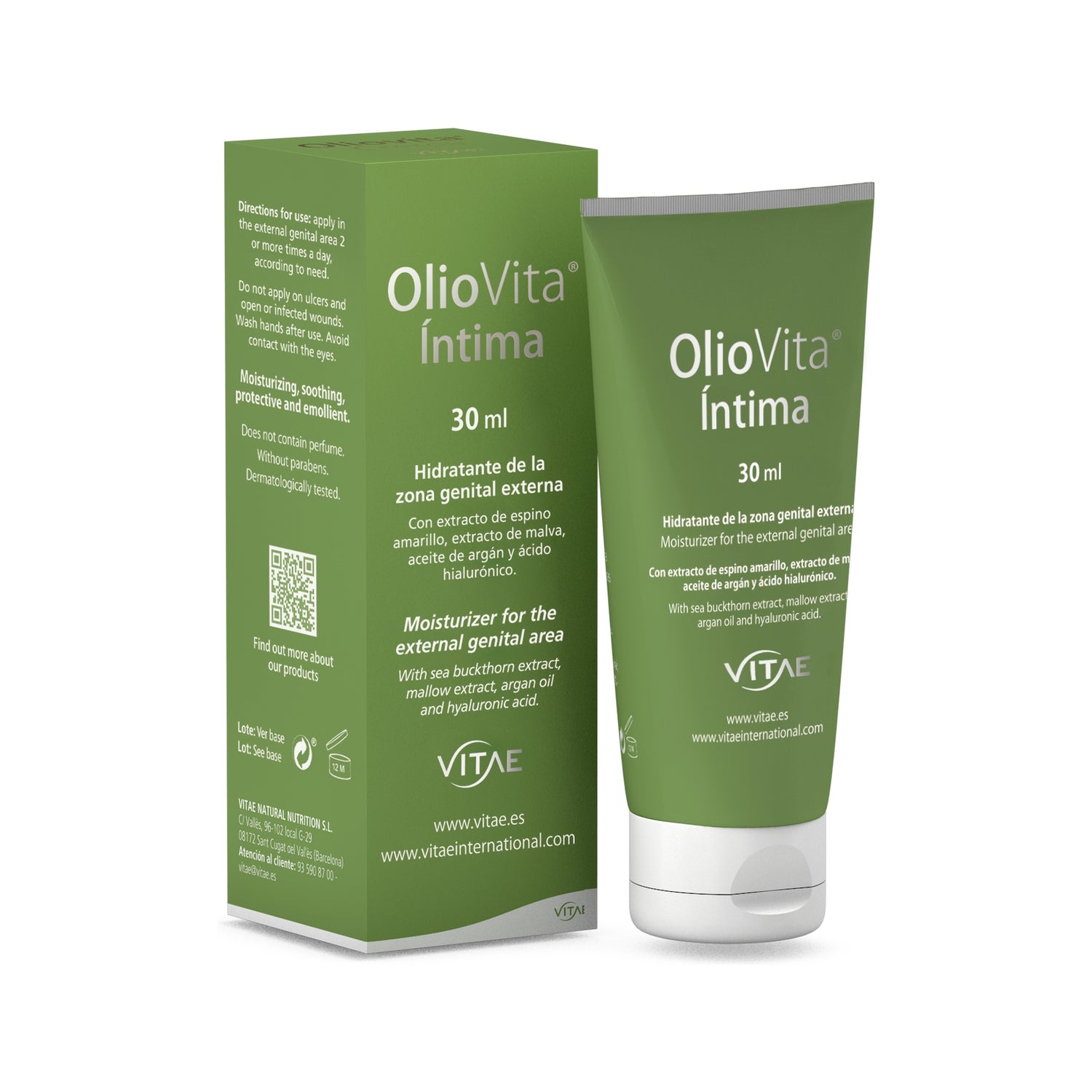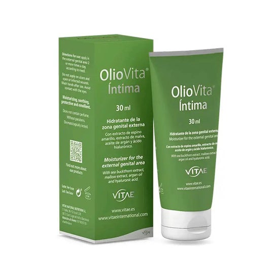 Vitae OlioVita Íntima Crema 30ml es una crema íntima de aplicación externa. Elaborada con extracto de espino amarillo (Hippophae rhamnoides), extracto de malva (Malva sylvestris), aceite de argán (Argania spinosa), aceite de sésamo, ácido hialurónico y péptidos calmantes.