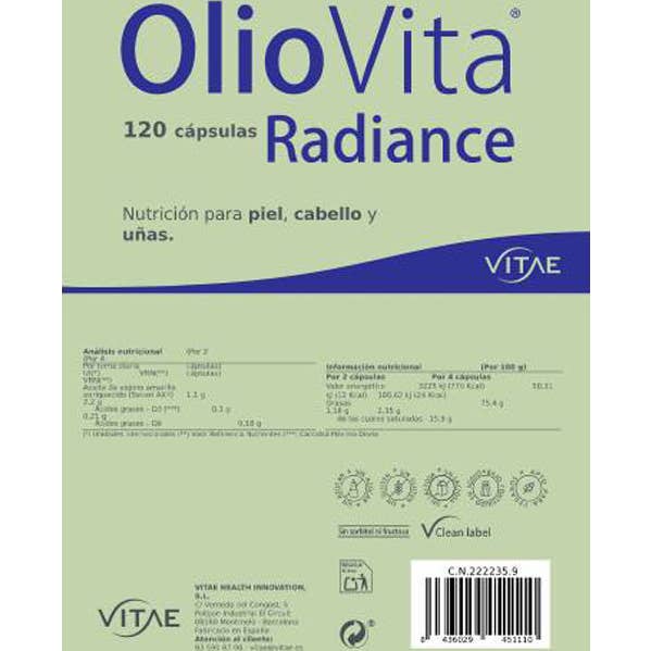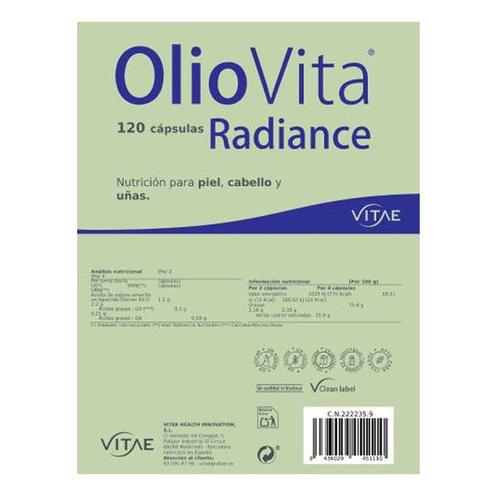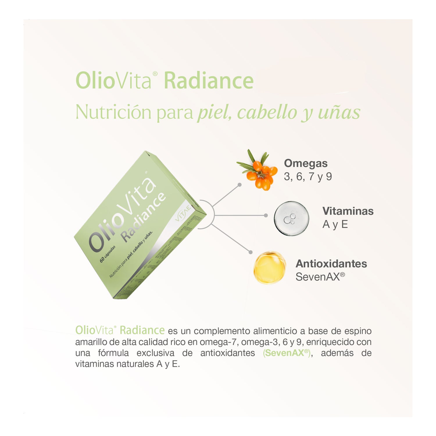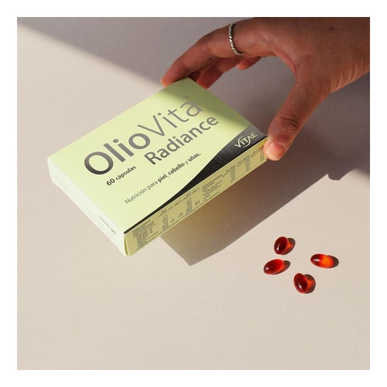 OlioVita Radiance es un suplemento antioxidante natural formulado con aceite de espino amarillo rico en omega 7, 3, 6 y 9 y el exclusivo complejo SevenAX®. Nutre desde el interior para mejorar la hidratación, elasticidad y luminosidad de la piel, al tiempo que fortalece el cabello y las uñas.