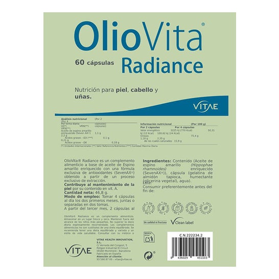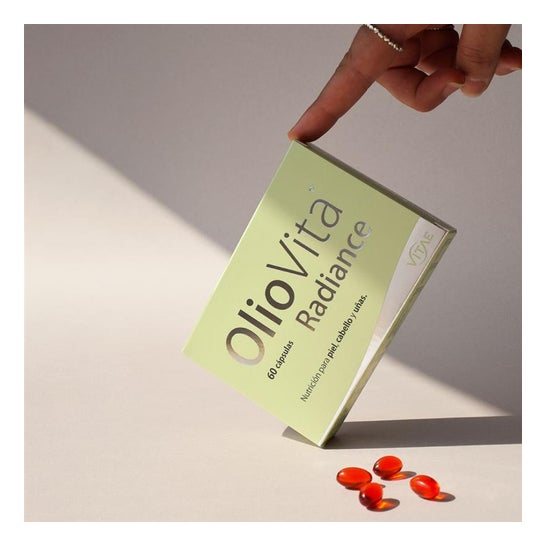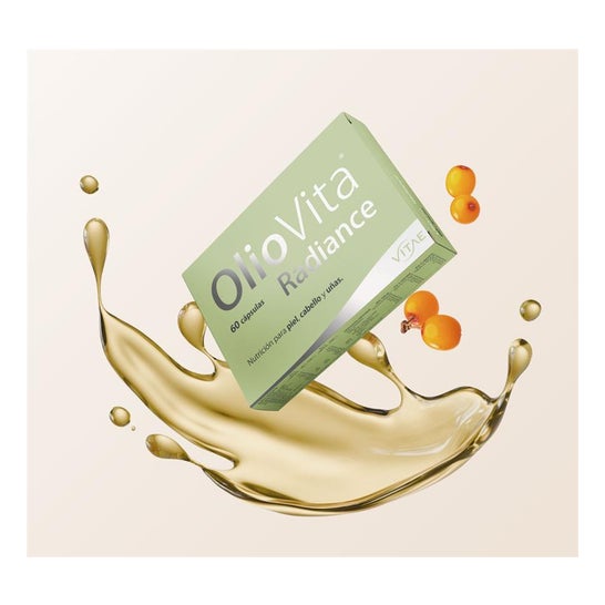 OlioVita Radiance es un suplemento antioxidante natural formulado con aceite de espino amarillo rico en omega 7, 3, 6 y 9 y el exclusivo complejo SevenAX®. Nutre desde el interior para mejorar la hidratación, elasticidad y luminosidad de la piel, al tiempo que fortalece el cabello y las uñas.