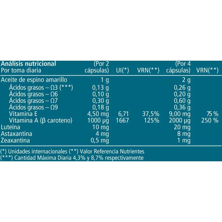 Aceite de espino amarillo (Hippophae rhamnoides), luteína, astaxantina y zeaxantina, cápsula (gelatina de almidón, tapioca, humectante (gelatina vegetal), agua).