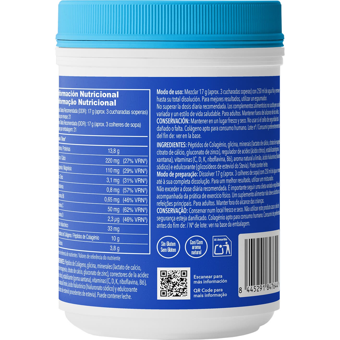 (ácido cítrico), estabilizante (goma xantana), vitaminas (C, D,K, riboflavina, B6), aroma natural limón, ácido hialurónico (hialuronato sódico) y edulcorante