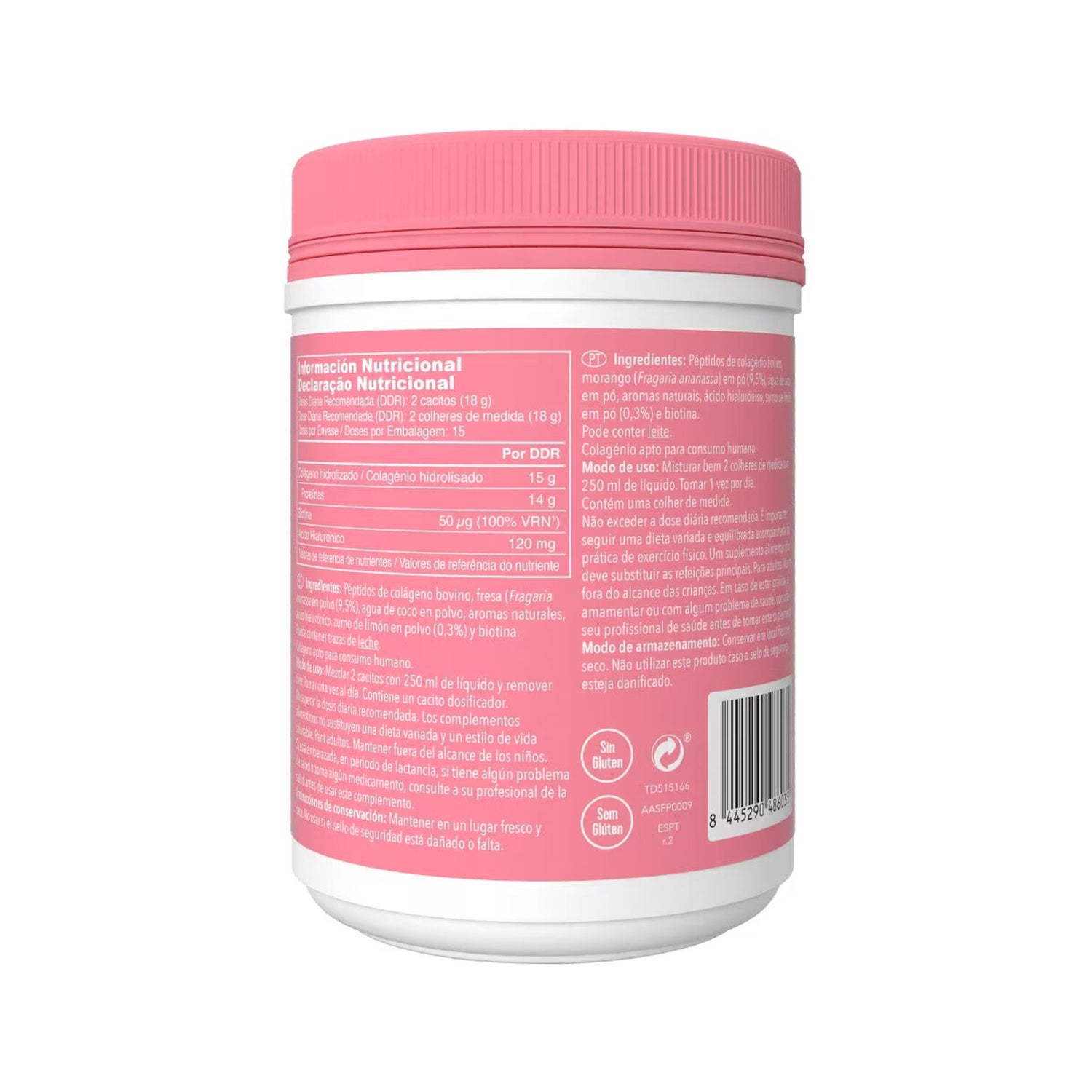 Péptidos de colágeno bovino, fresa en polvo (7,5%), inulina, aromas, zumo de limón deshidratado (2,4%), agua de coco en polvo, ácido hialurónico (hialuronato sódico) y biotina.
