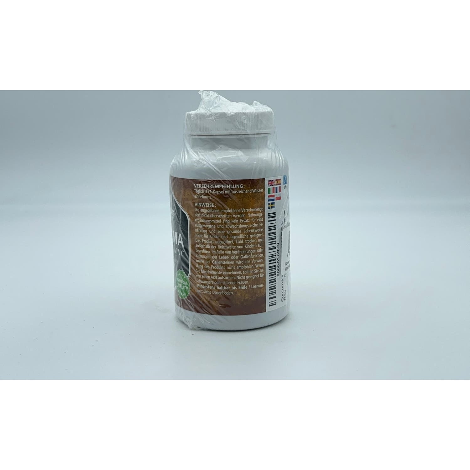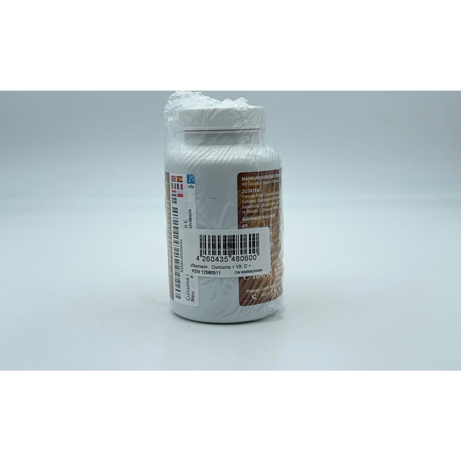 Cúrcuma en polvo, Incrementador de volumen (Celulosa microcristalina), Cáscara de la cápsula (Hidroxipropilmetilcelulosa), Extracto de cúrcuma, Ácido ascórbico (Vitamina C), Extracto de pimienta negra.