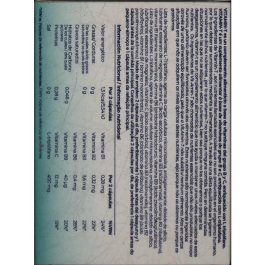 Vitamin-T® Triptófano 30caps es un complemento alimenticio que aporta triptófano libre que activa de manera natural la serotonina y las vitaminas relacionadas con su metabolismo: vitamina B9 (ácido fólico), vitamina B1, vitamina B2, vitamina B3, vitamina B6 y vitamina C.