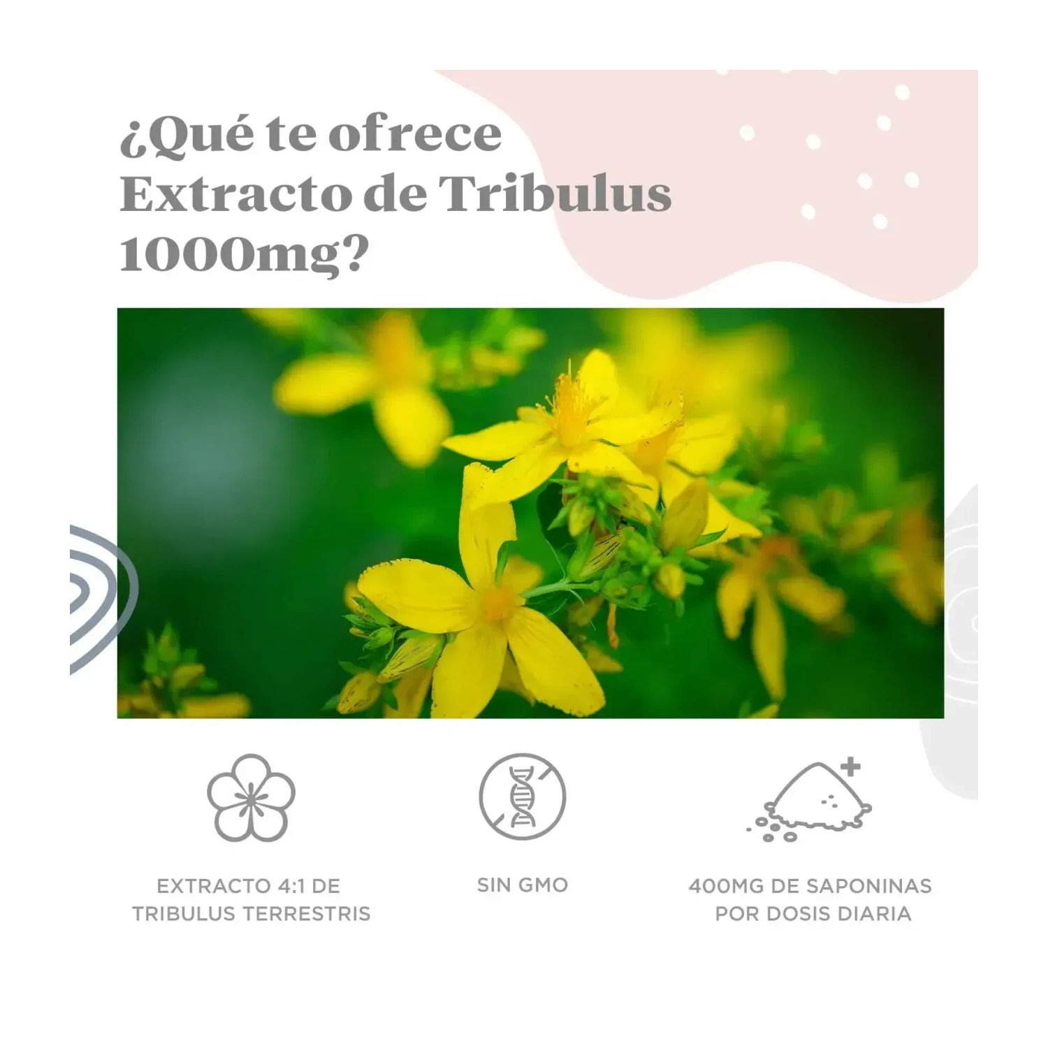1000mg de Tribulus terrestris por dosis. 4 veces más concentrado. Extraído exclusivamente del fruto. Estandarizado al 40% en saponinas. Con Zinc y Vitamina B6. Apto para veganos.