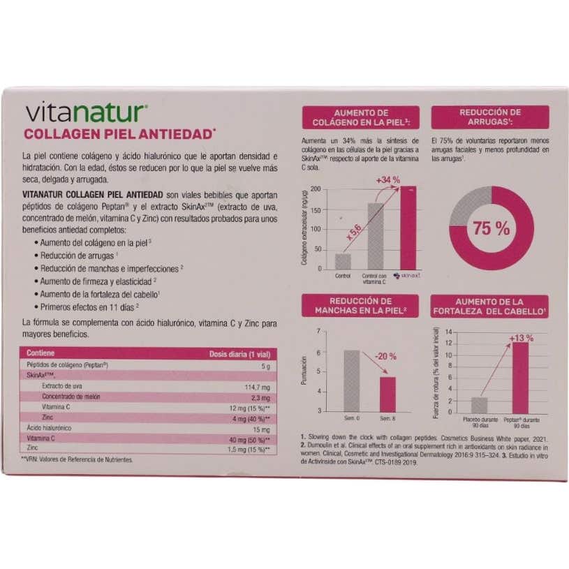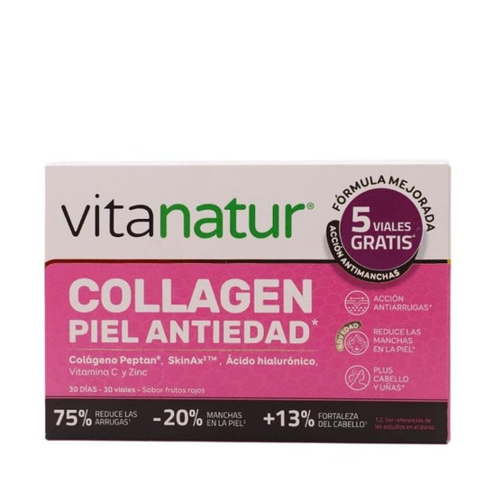 Vitanatur Collagen Antiaging Regeneración de la Piel 30 viales es un complemento alimenticio formulado a base de colágeno y ácido hialurónico. Viene en formato de viales bebibles con sabor a frutos rojos.