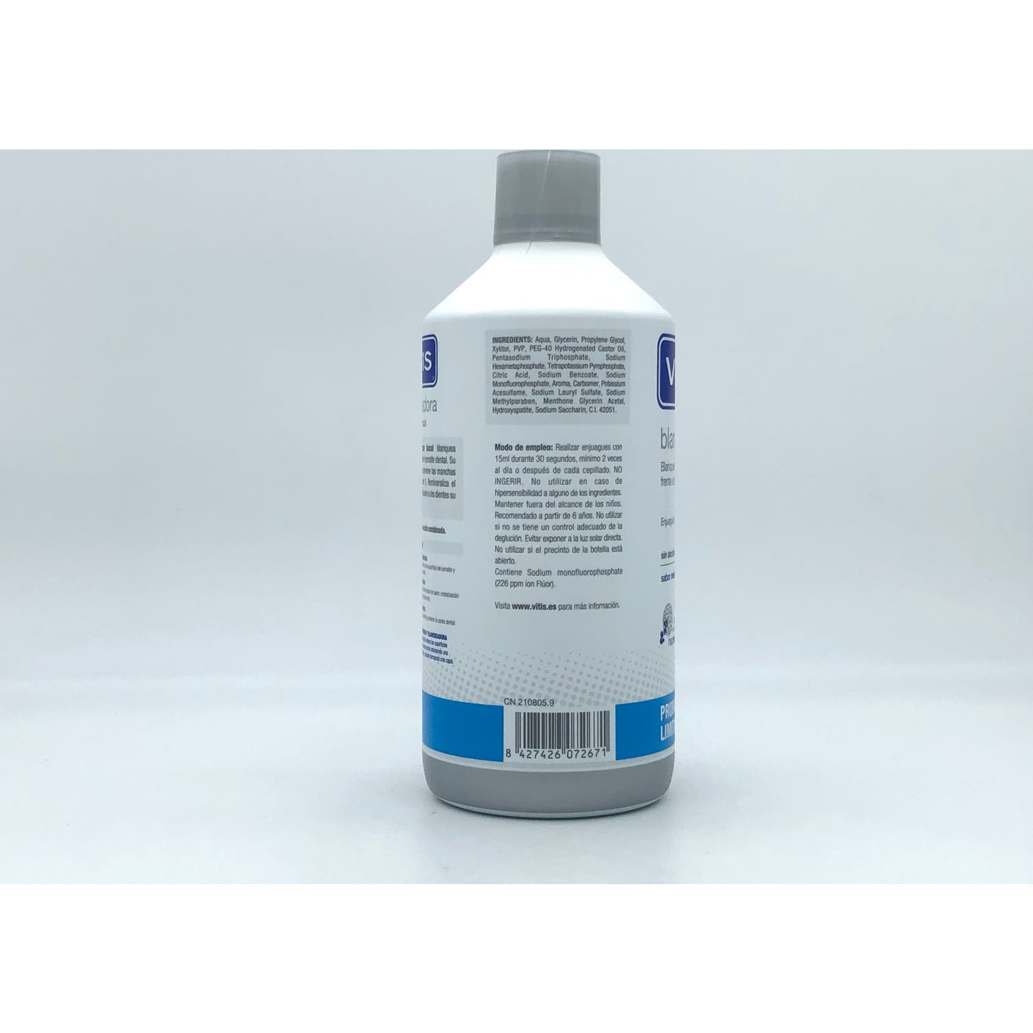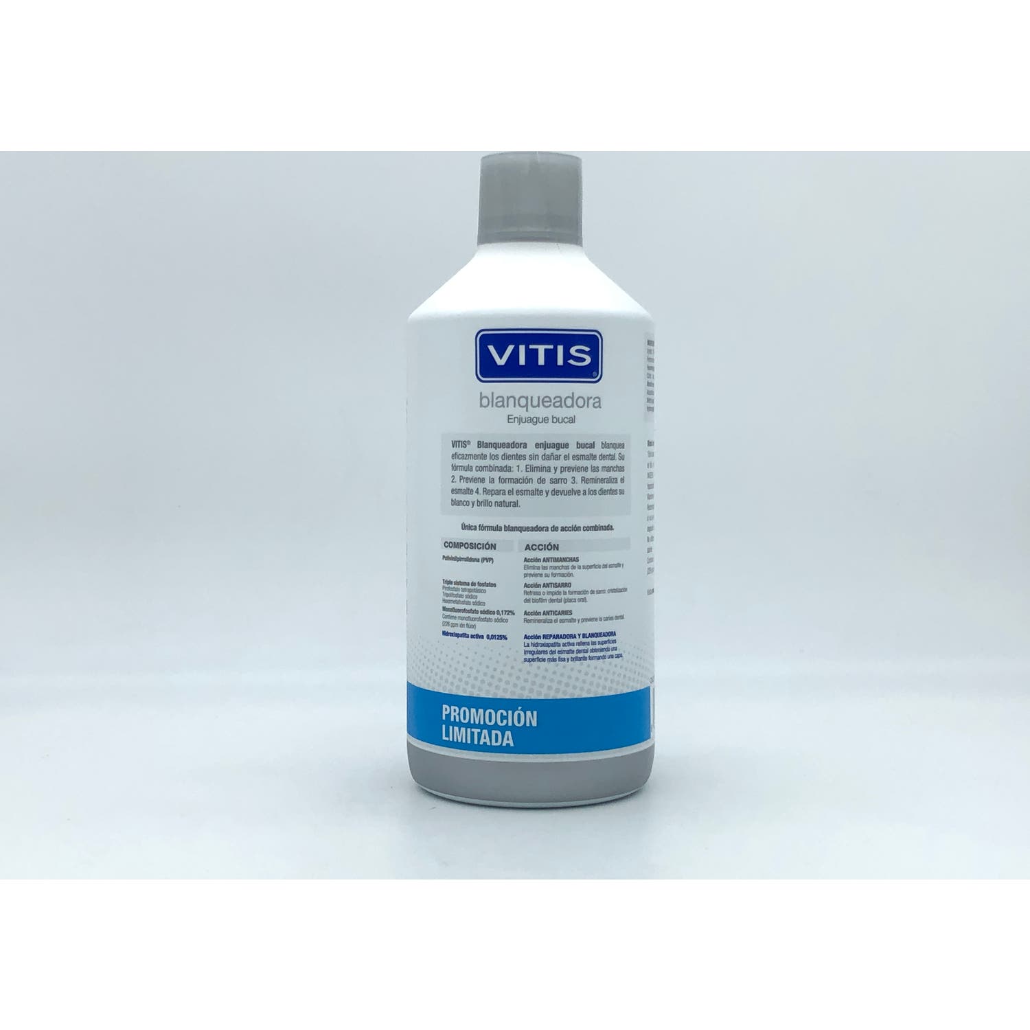 Vitis Blanqueadora Colutorio 1000ml es un colutorio de acción blanqueadora que contribuye a eliminar los tonos amarillentos del esmalte dental. Asimismo, su fórmula ayuda a prevenir la sensibilidad dental.
