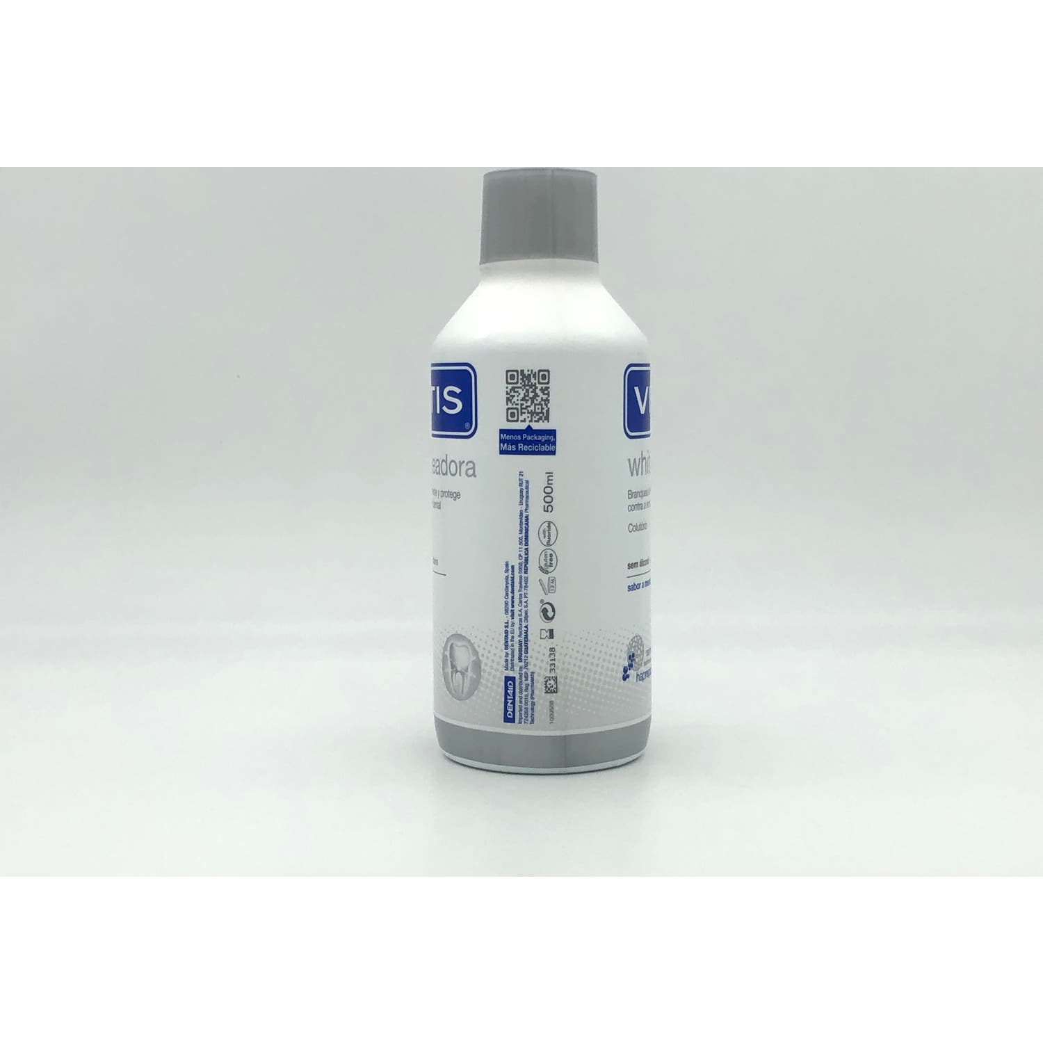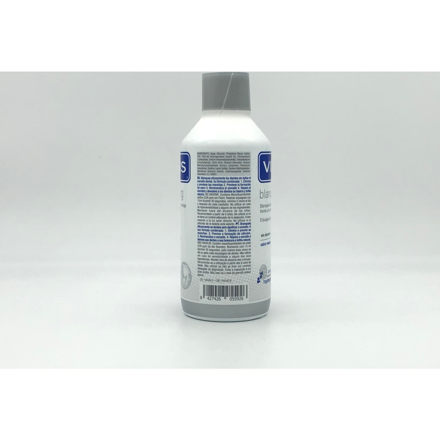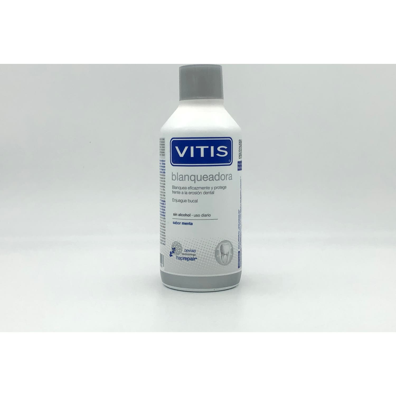 Vitis® colutorio blanqueador 500ml que combina 4 acciones que ayudan a la eficacia de la limpieza dental. Elimina las manchas de la superficie del esmalte dental, retrasa e impide la formación de sarro, protege y remineraliza el esmalte y las nanopartículas de hidroxiapatita se integran en el esmalte y rellenan sus superficies irregulares, a la vez que reparan el esmalte dental.