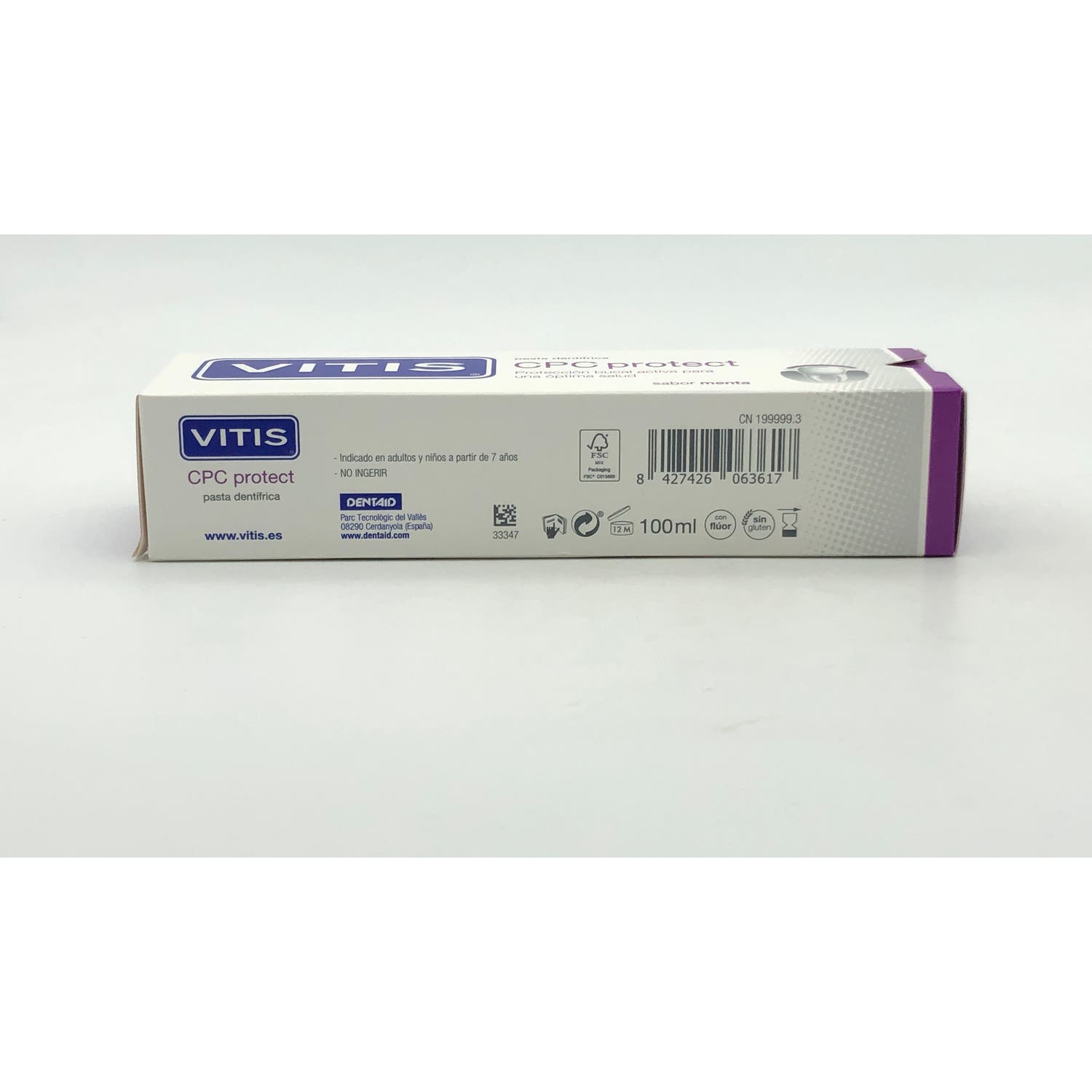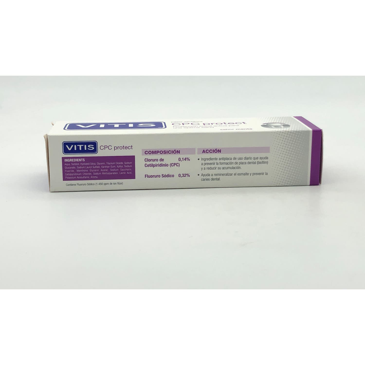 Vitis CPC Protect Dentífrico Menta 100ml es una pasta de dientes de sabor a menta que ayuda a obtener un cuidado diario bucal, también a prevenir la formación de placa dental y reducir su acumulación y a la prevención de caries dental.
