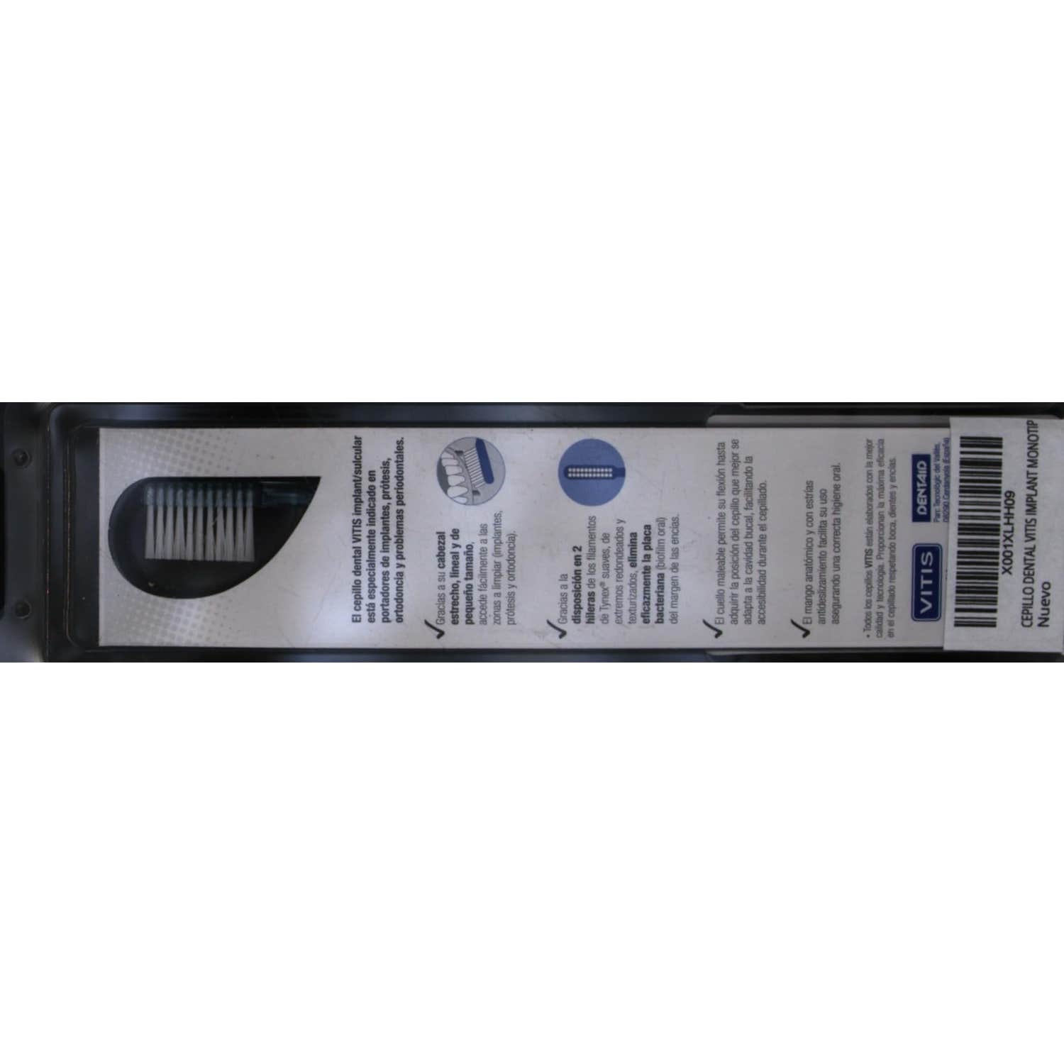 El cabezal pequeño de Vitis Implant Monotip cepillo incluye filamentos de Tynex dispuestos en un monopenacho, eliminando el biolfilm oral mientras protegen la cavidad bucal.