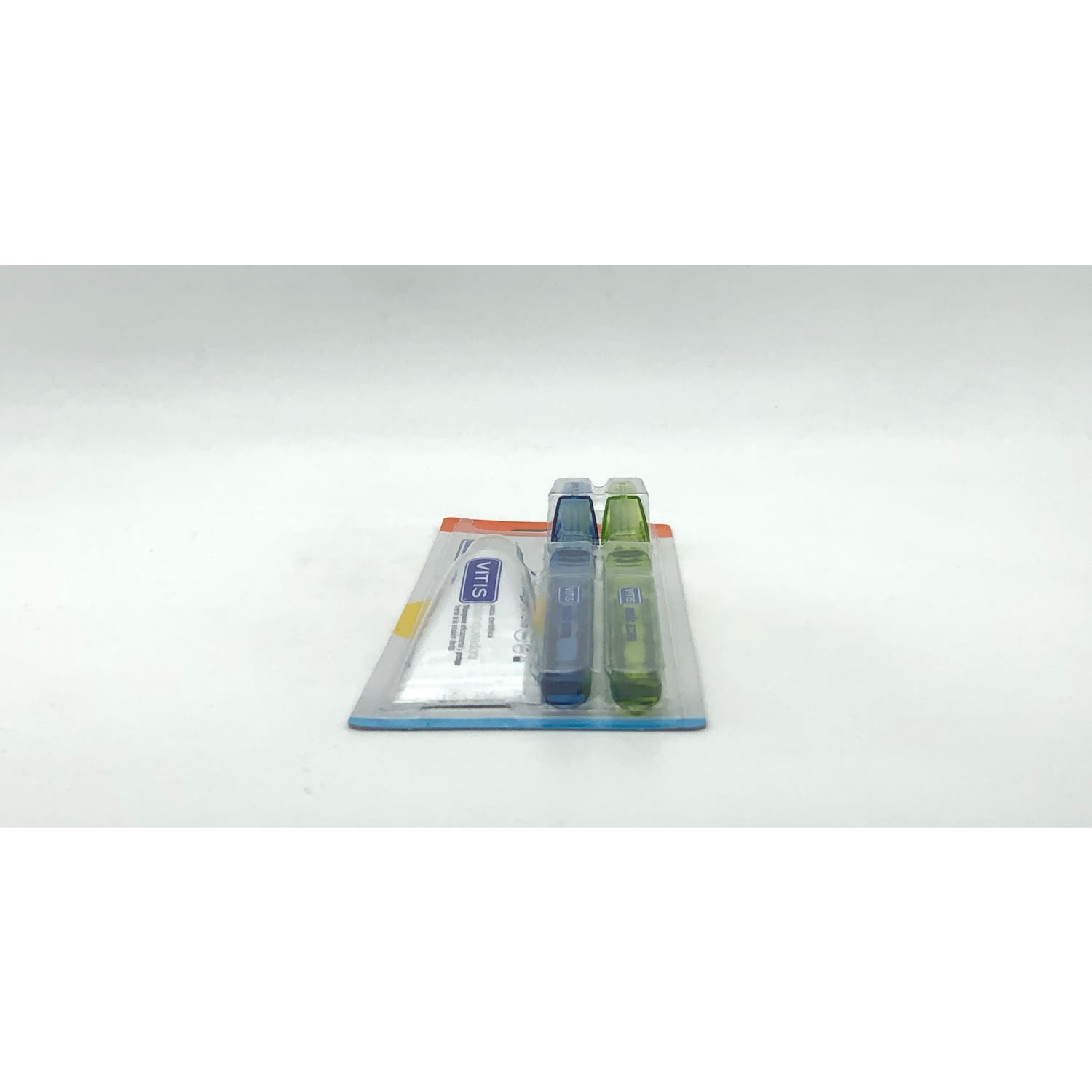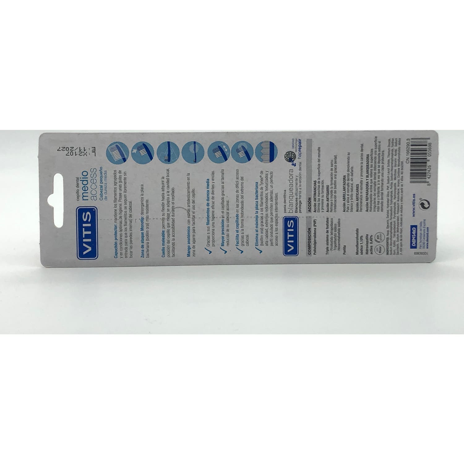 Vitis Cepillo Medio Access 2uds + Dentífrico es un pack de higiene bucal compuesto por dos cepillos de dientes y un dentífrico en formato mini.