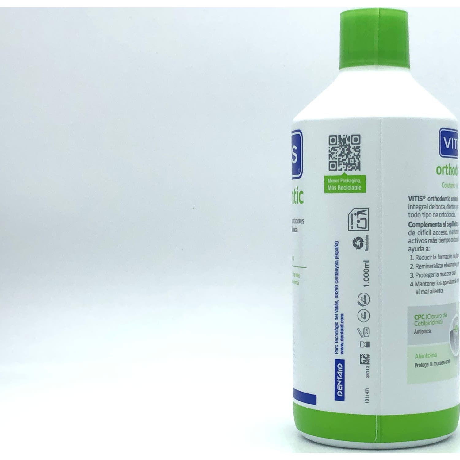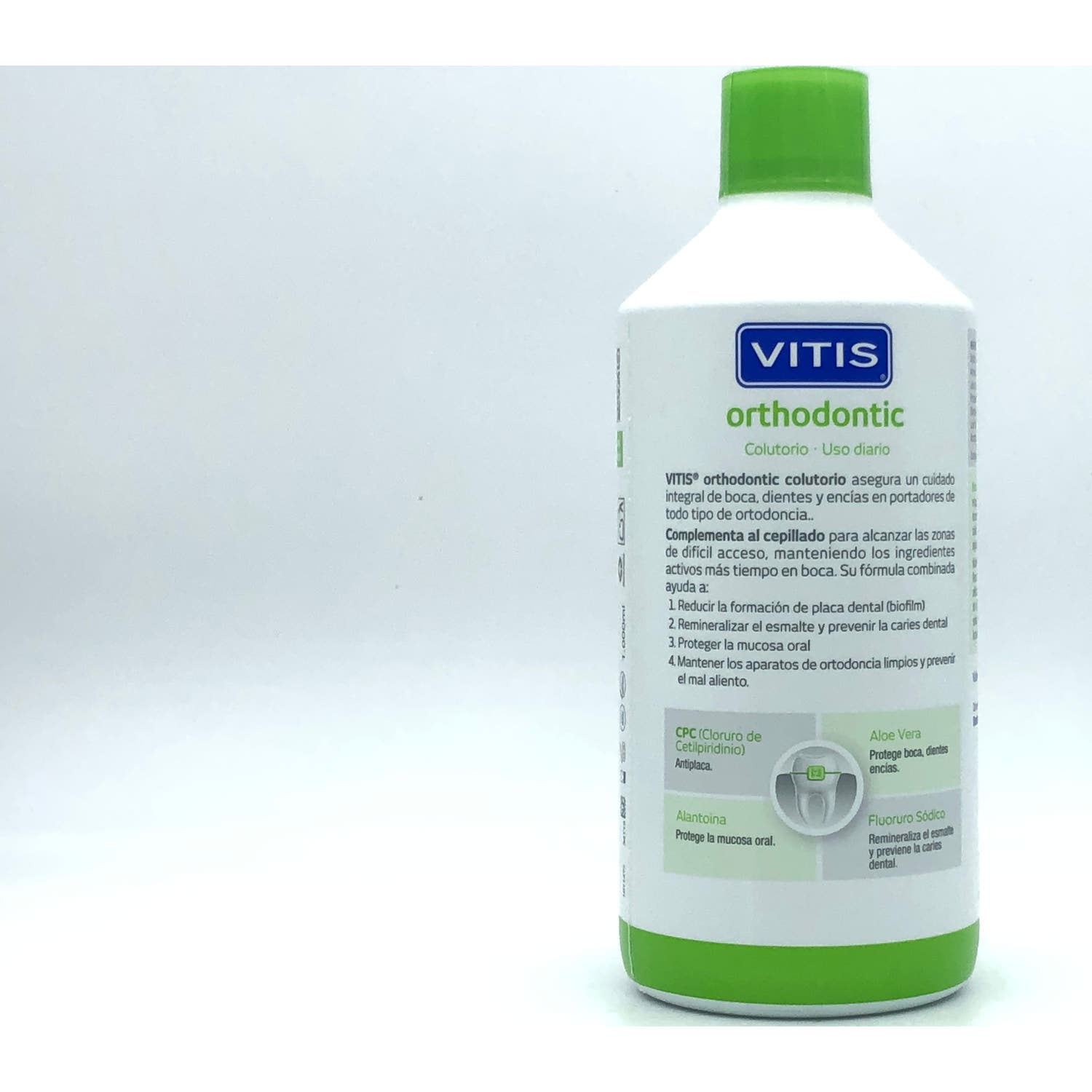Vitis Orthodontic Colutorio 1000ml es un enjuague que ayuda a mantener la higiene bucal diaria en personas que lleven aparatos dentales. Además, aporta una acción antiplaca adicional, así como principios activos que ayudan a la protección del esmalte dental.