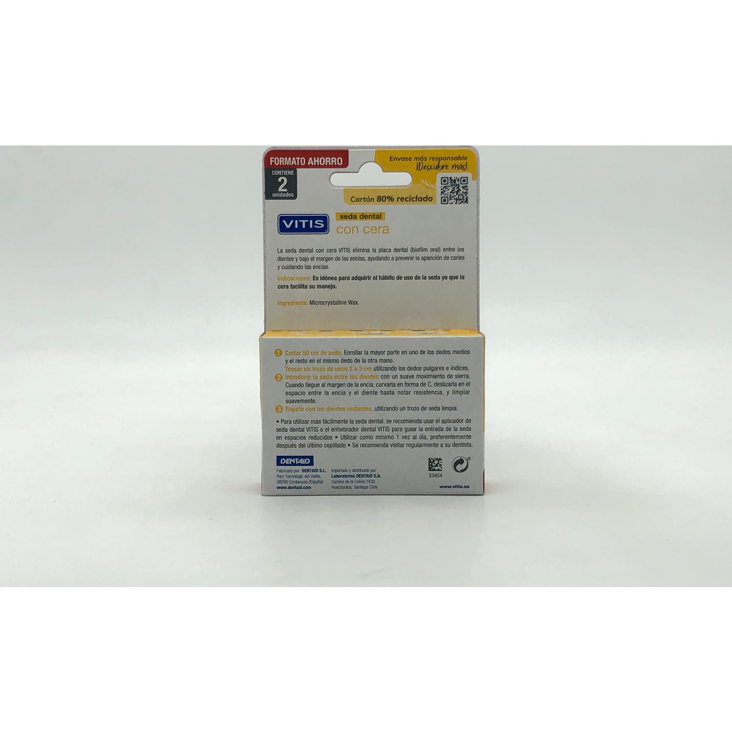 Vitis Seda Dental con Cera 2x50m es una seda elaborada con cera para reducir eficazmente la placa bacteriana interdental y bajo la línea de las encías previniendo la aparición de caries, gingivitis y enfermedad periodontal.