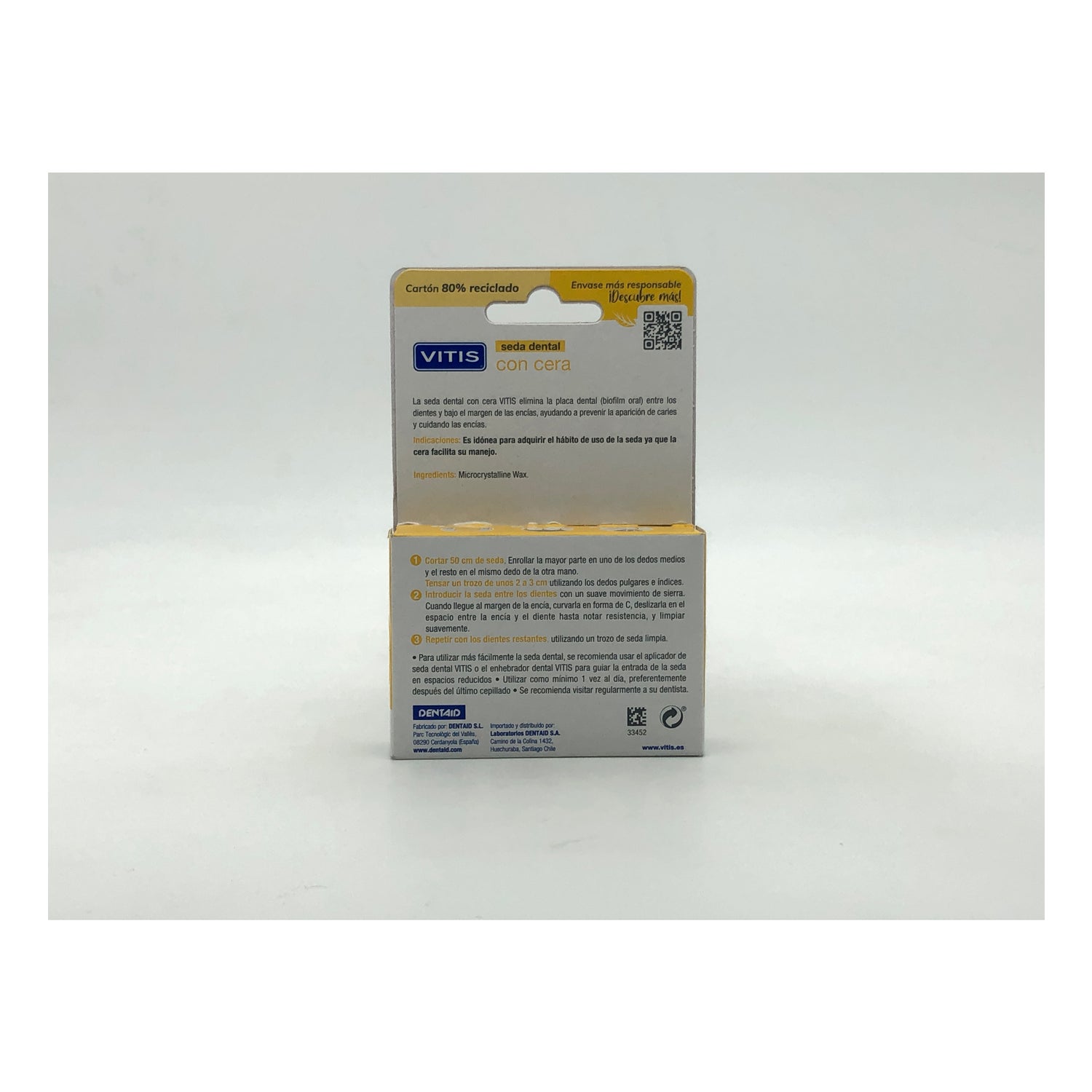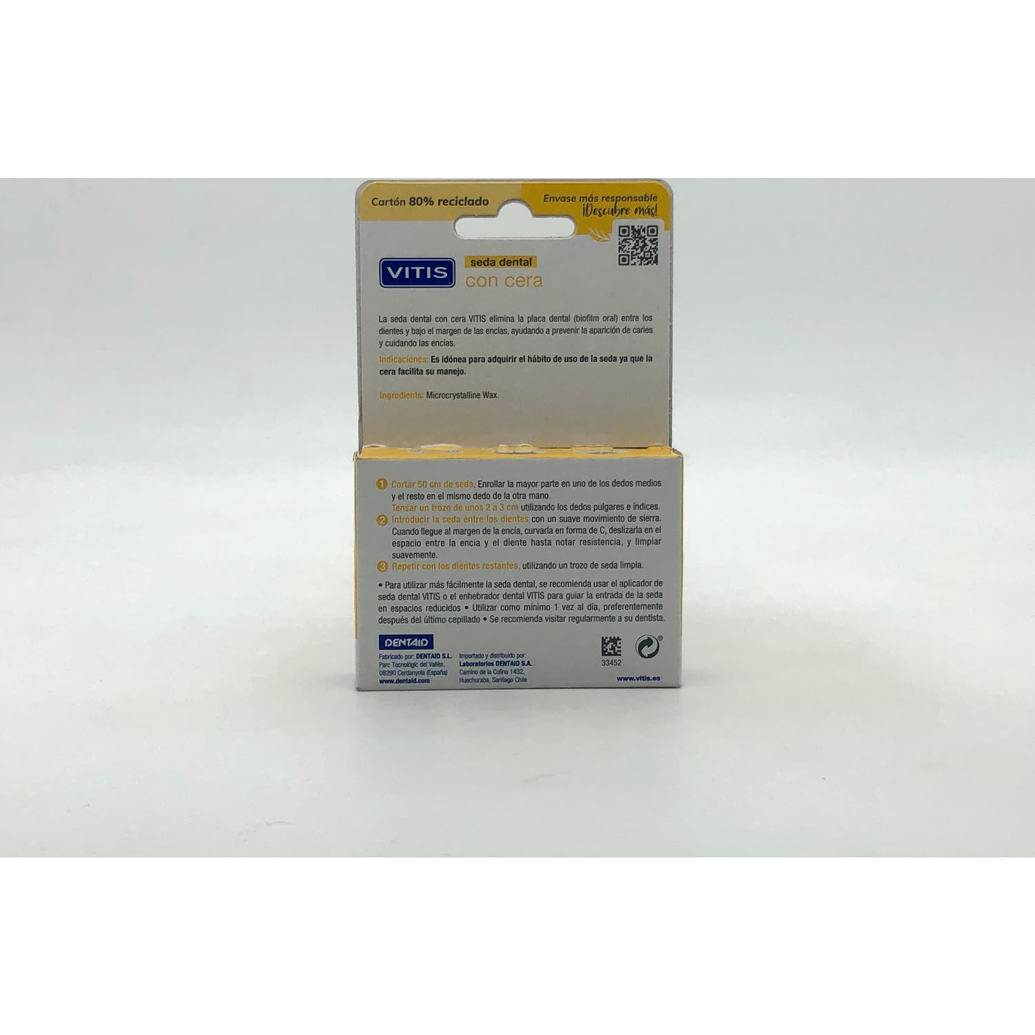 Vitis Seda Dental con Cera 50m es una seda dental con cera que ayuda a eliminar con suavidad los restos de comida que se acumulan alrededor de las encías.