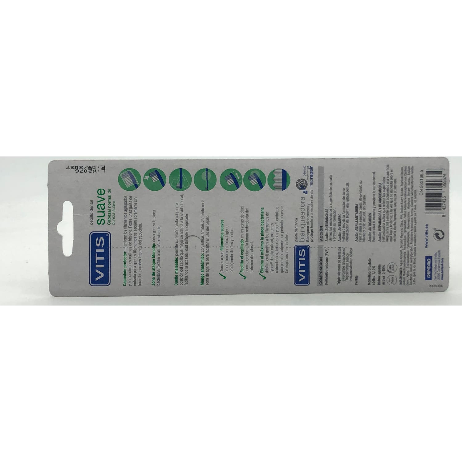 Vitis Suave Cepillo Dental 2uds son cepillos de uso diario cuentan con un cabezal pequeño para acceder a todas las zonas de la boca, y filamentos de dureza media. Cuentan con un cuello que permite cierta flexión para adaptarse a la cavidad bucal, y un mango anatómico y con estrías antideslizamiento que facilitan su uso. Además, vienen con un capuchón protector.