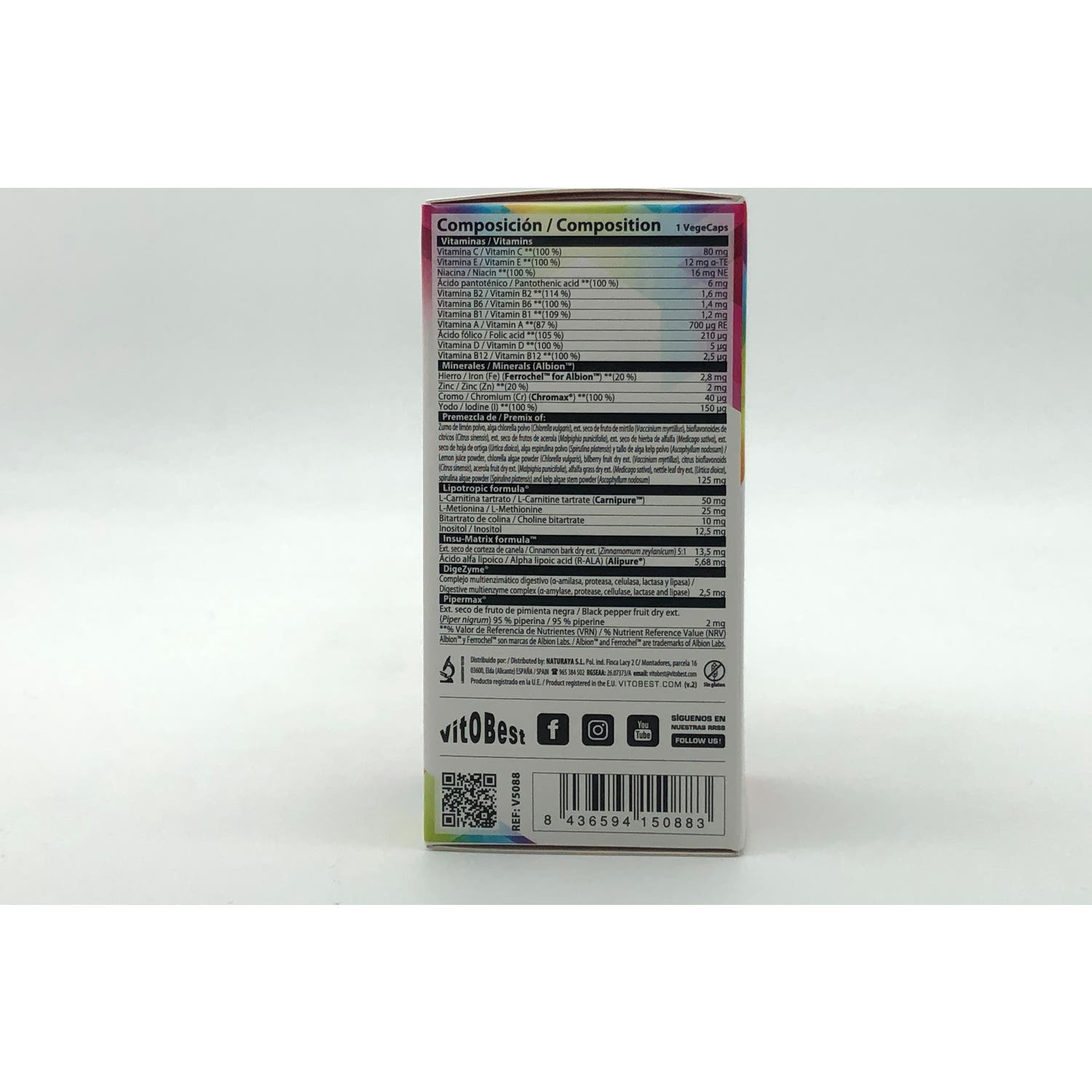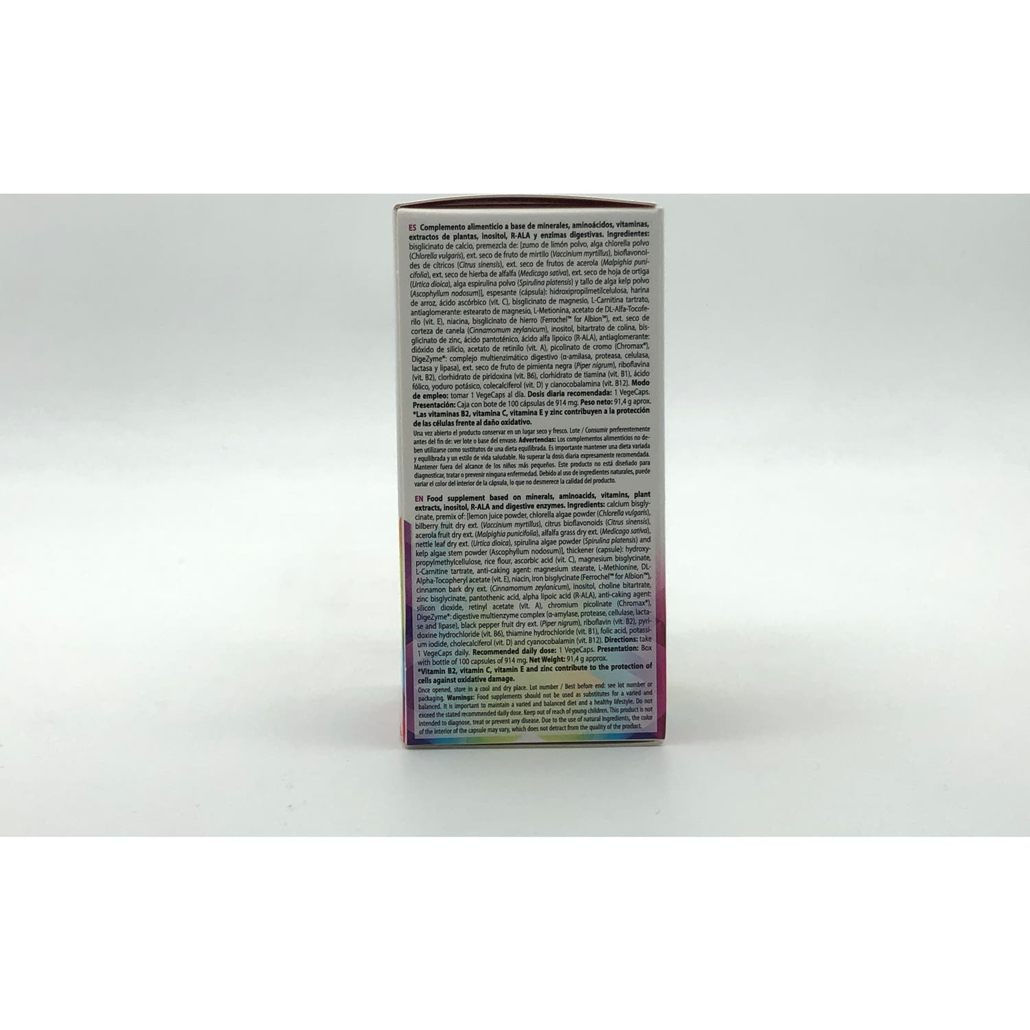 Bisglicinato de calcio (Albion™), Oxxynea®: (concentrado de extractos de uvas rojas y blancas, naranja, pomelo, arándano, papaya, piña, fresa, manzana, albaricoque, cereza, grosella negra, tomate, zanahoria, té verde, brócoli, repollo, cebolla, ajo, oliva, germen de trigo (gluten), pepino y espárrago), Espesante (cápsula): hidroxipropilmetilcelulosa, antiaglomerante: harina de arroz, ácido ascórbico (vitamina C) (Quali®-C) (DSM®), Bisglicinato de magnesio (Albion™), L-Carnitina tartrato (Carnipure™), L-Metionina, antiaglomerante: estearato de magnesio, acetato de DL-alfa-tocoferilo (vitamina E) (Quali®-E) (DSM®), Niacina (vitamina B3) (Quali®-B) (DSM®), bisglicinato de hierro (Ferrochel™ for Albion™), Extracto seco de canela (Zinnamomum zeylanicum), Inositol, Bitartrato de colina, bisglicinato de zinc (Albion™), Pantotenato cálcico (vitamina B5) (Quali®-B) (DSM®), Ácido alfa lipoico (R-ALA) (Alipure®), Acetato de retinilo (vitamina A) (Quali®-A) (DSM®), Picolinato de cromo (Chromax®), DigeZyme®: complejo multienzimático digestivo (α-amilasa, proteasa, celulasa, lactasa y lipasa), Cianocobalamina (vitamina B12) (Quali®-B) (DSM®), Antiaglomerante: dióxido de silicio, Piperimax®: extracto seco de fruto de pimienta negra (Piper nigrum), Riboflavina (vitamina B2) (Quali®-B) (DSM®), Clorhidrato de piridoxina (vitamina B6) (Quali®-B) (DSM®), Clorhidrato de tiamina (vitamina B1) (Quali®-B) (DSM®), Ácido fólico (vitamina B9) (Quali®-B) (DSM®), Yoduro potásico y Colecalciferol (vitamina D) (Quali®-D) (DSM®).