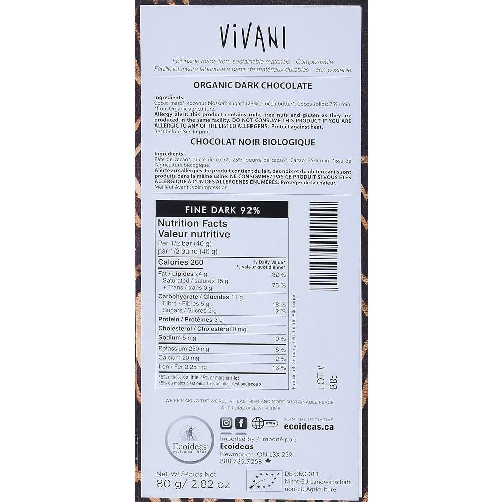 Vivani Panama Chocolate Negro 92% 80 gr es una tableta de chocolate ecológico de 80 g elaborada con un 92% de cacao puro de Panamá y endulzado con azúcar de flor de coco. Ofrece un sabor suave con notas de caramelo y un perfil aromático equilibrado, con menor amargor pese a su intensidad.