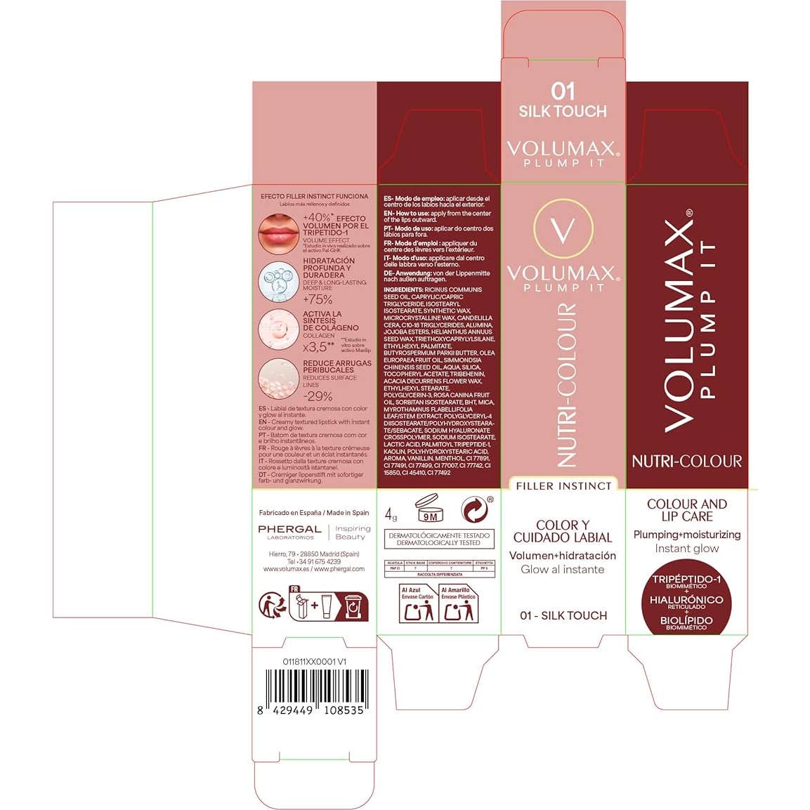 Volumax Plump It Nutri Color 01 Silk Touch 4 gr es un tratamiento labial antiedad que actúa como un filler sin agujas, diseñado para proporcionar un cuidado completo de los labios. Su formulación incluye cinco activos inteligentes que trabajan en conjunto para lograr resultados visibles.