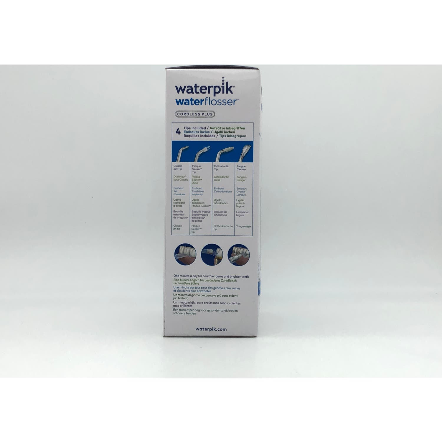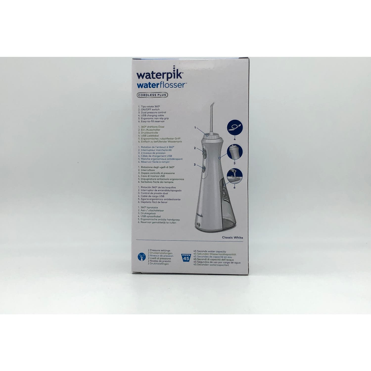 Waterpik Irrigador Inalámbrico Plus WP-490 Blanco 1ud es un irrigador bucal portátil con autonomía, perfecto para baños pequeños o para viajar.