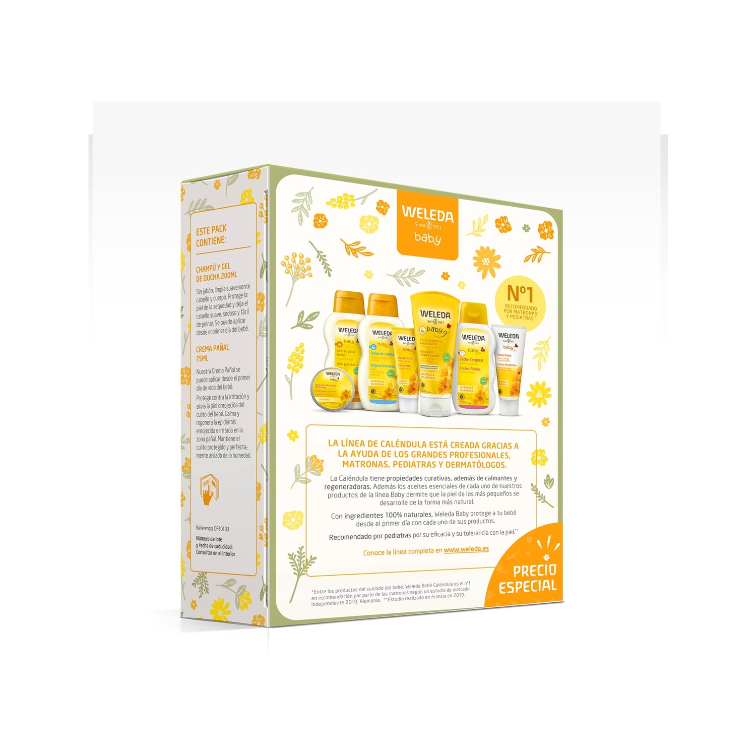 Weleda Baby Pack Los Esenciales para tu Bebé es un conjunto de productos de la línea Weleda Caléndula que proporcionan un cuidado 100% natural para la piel del bebé. Este pack incluye el Champú y Gel de Ducha 2 en 1 de Caléndula Bebé, que limpia suavemente el cabello y el cuerpo sin jabón, protegiendo la piel de la sequedad y dejando el pelo suave y fácil de peinar. También contiene la Crema Pañal de Caléndula Bebé, que calma e regenera la piel irritada en la zona del pañal, manteniendo protegido el culito del bebé de la humedad.