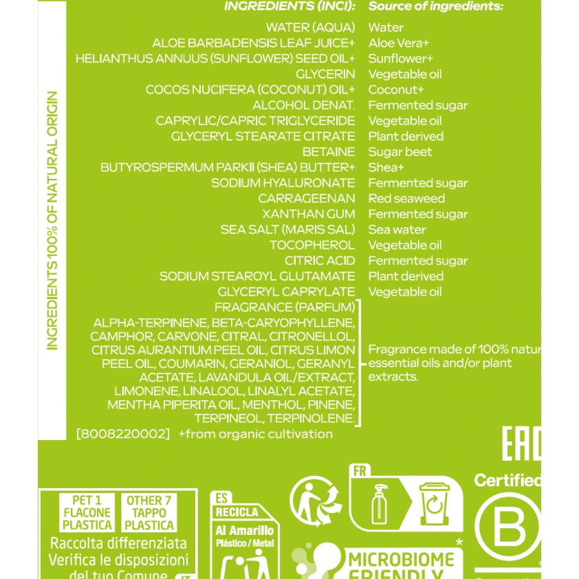 Water (Aqua), Aloe Barbadensis Leaf Juice+, Helianthus Annuus (Sunflower) Seed Oil+,Glycerin, Cocos Nucifera (Coconut) Oil+Alcohol denat.Caprylic/Capric Triglyceride, Glyceryl Stearate Citrate, Betaine, Butyrospermum Parkii (Shea) Butter+Sodium Hyaluronate , Carrageenan, Xanthan Gum, Sea Salt (Maris Sal), Tocopherol, Citric Acid, Sodium Stearoyl Glutamate, Glyceryl Caprylate, Fragrance (Parfum)
