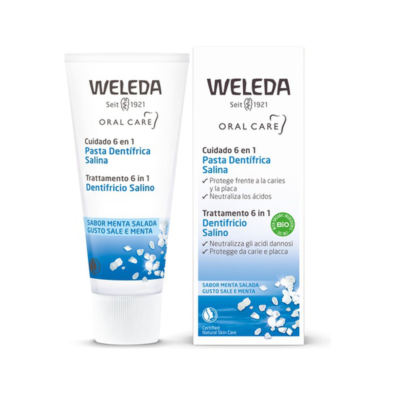 - El Dentífrico Pasta Salada de los Laboratorios Weleda contiene aceites esenciales que, combinados con el sabor salado de este dentífrico, proporcionan una sensación de frescor duradera. - Un extracto de resina de mirra, con propiedades calmantes y antisépticas, actúa sobre el proceso de sensibilización de la cavidad bucal. - Un extracto de raíz de Ratanhia, con propiedades astringentes, reafirma las encías. - Y un extracto de corteza de castaño de Indias combinado con aesculina completa juiciosamente estas acciones gracias a los taninos antisépticos que contiene. - Compatible con los tratamientos homeopáticos. - Cosmética natural certificada BDIH. - Sin conservantes, colorantes ni fragancias sintéticas. - No testado en animales. INFORMACIÓNLa Pasta Dentífrica Salina de los laboratorios Weleda, enriquecida con sales marinas, estimula la secreción salival, permitiendo la autolimpieza natural de los dientes. Ayuda a neutralizar los ataques ácidos responsables de la formación de caries y garantiza la protección contra la formación de sarro. INDICACIÓN