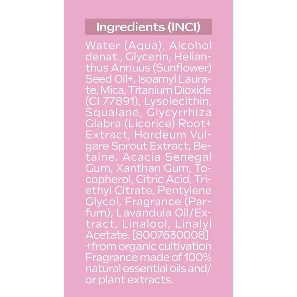 Water (Aqua), Alcohol denat., Glycerin, Helianthus Annuus (Sunflower) Seed Oil+, Isoamyl Laurate, Mica, Titanium Dioxide, Lysolecithin, Squalane, Glycyrrhiza Glabra (Licorice) Root+ Extract, Hordeum Vulgare Extract, Betaine, Acacia Senegal Gum, Xanthan Gum, Tocopherol, Citric Acid, Triethyl Citrate, Pentylene Glycol, Fragrance (Parfum), Lavandula Oil/ Extract, Linalool, Linalyl Acetate. [8007630008] +from organic cultivation