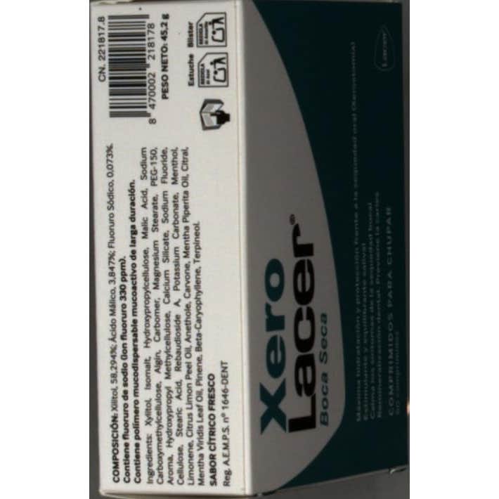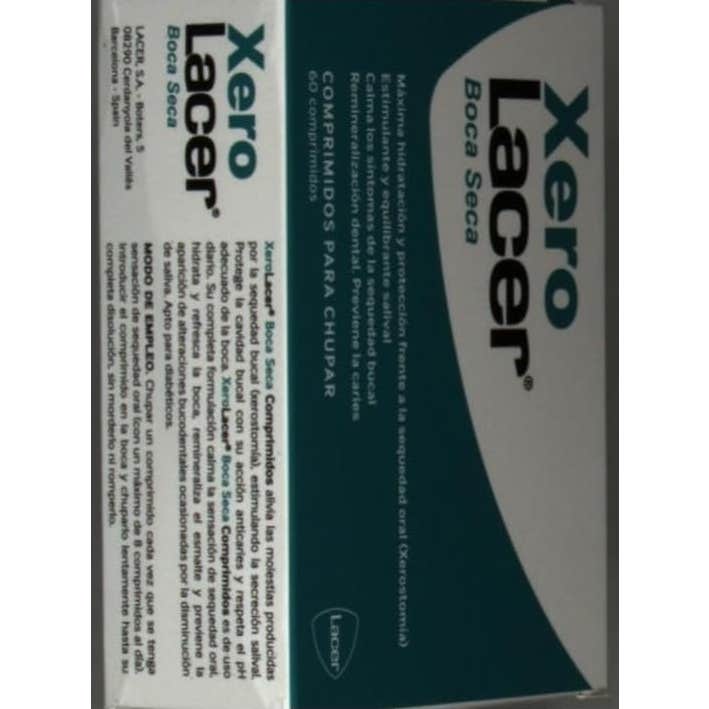 XeroLacer Boca Seca Comprimidos son de uso diario, especialmente desarrollados para el cuidado de la boca seca (Xerostomía). Su completa formulación calma la sensación de sequedad oral, refresca la boca, remineraliza el esmalte y refuerza las encías, previniendo la aparición de alteraciones buco-dentales ocasionadas por la disminución de saliva.