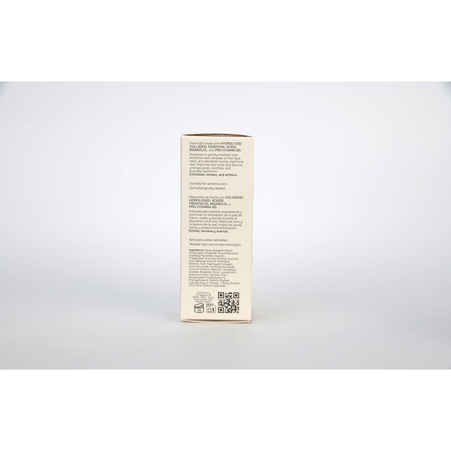 Mascarilla facial nocturna formulada con COLÁGENO HIDROLIZADO, ÁCIDOS SUAVES (GLUCONOLACTONA y ÁCIDO SHÍKIMICO), BISABOLOL y PRO-VITAMINA B5.