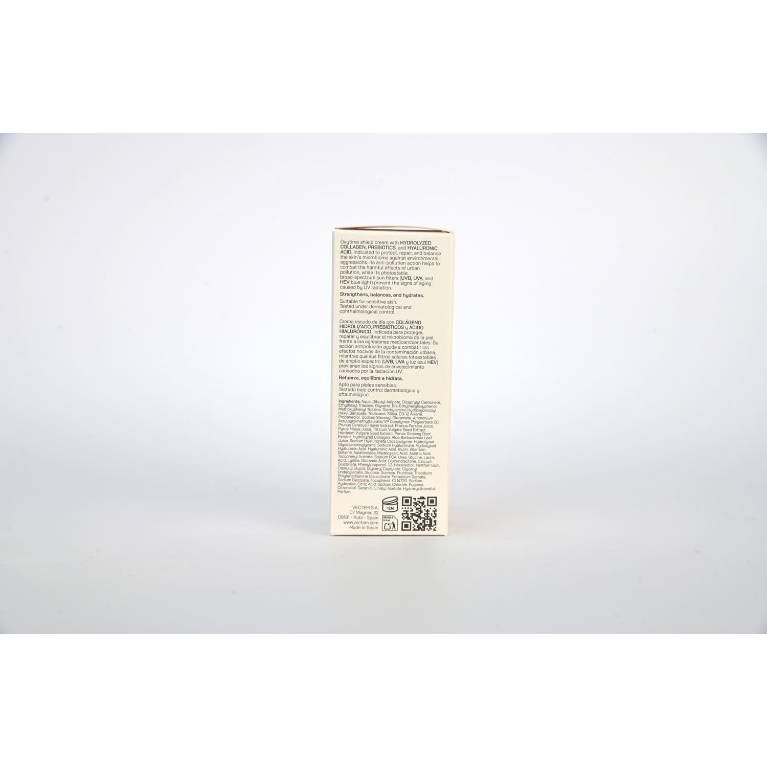 Crema escudo de día con COLÁGENO HIDROLIZADO, ÁCIDO HIALURÓNICO en múltiples formas y PREBIÓTICOS.