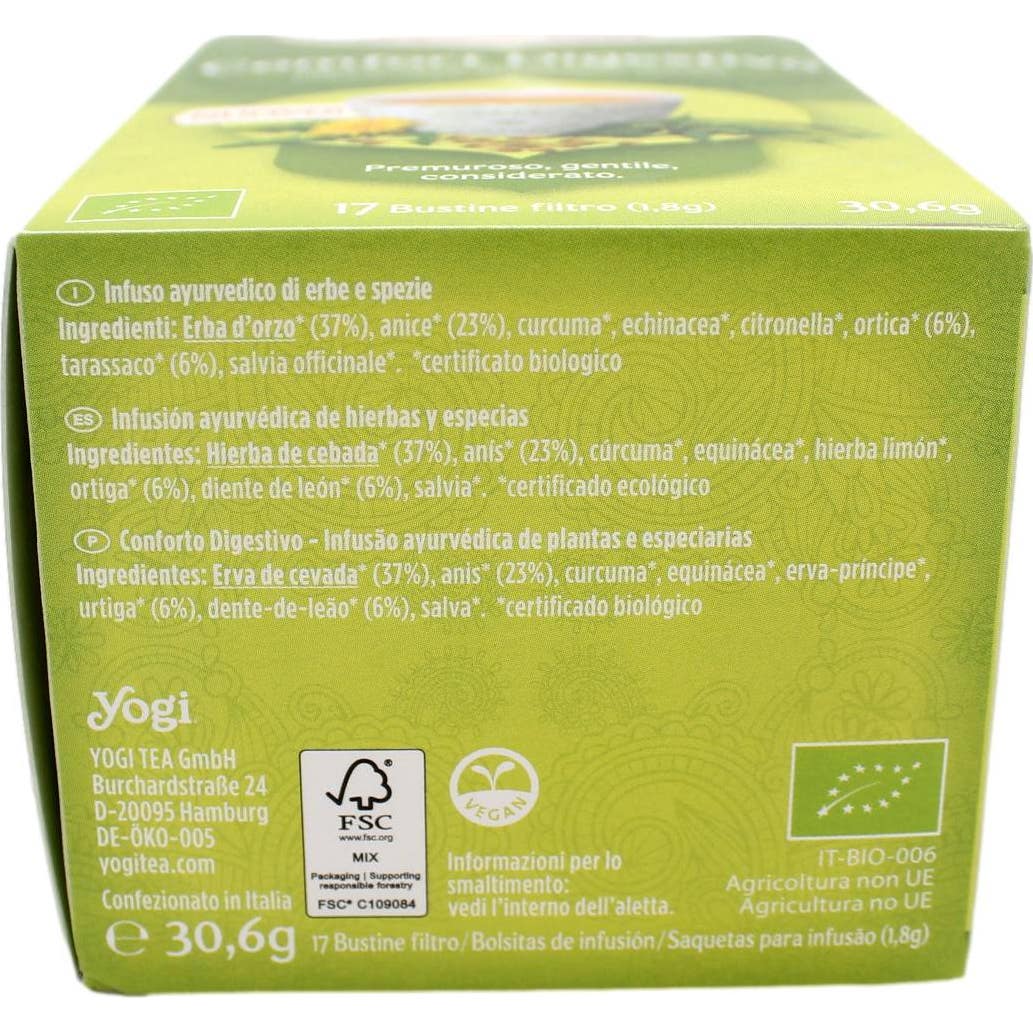 Yogi Tea Confort Digestivo Bio 17 Bolsitas es una infusión ayurvédica ecológica sin cafeína, pensada para favorecer una digestión ligera y aportar bienestar después de las comidas. Ofrece un sabor suave y equilibrado, adecuado para cualquier momento del día.