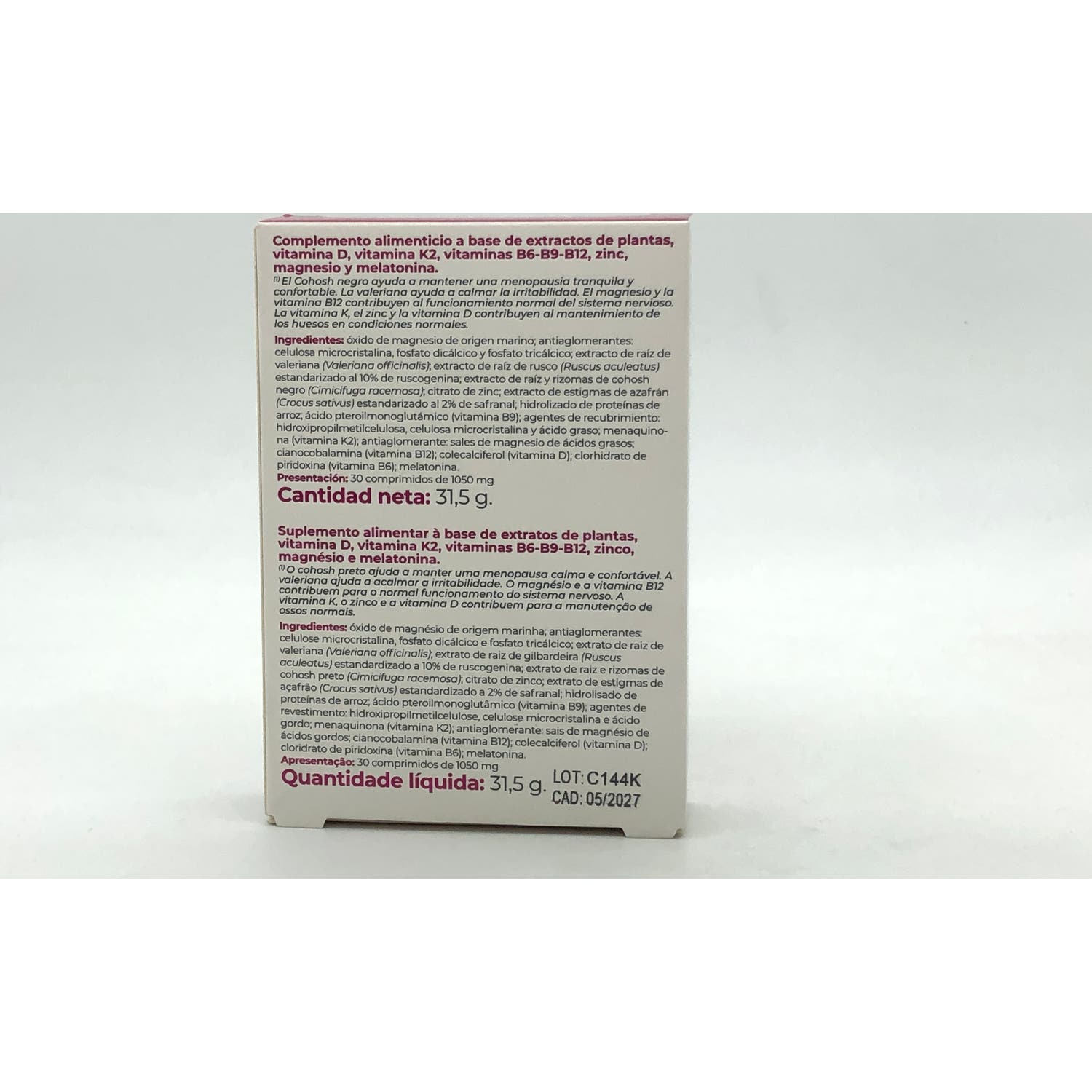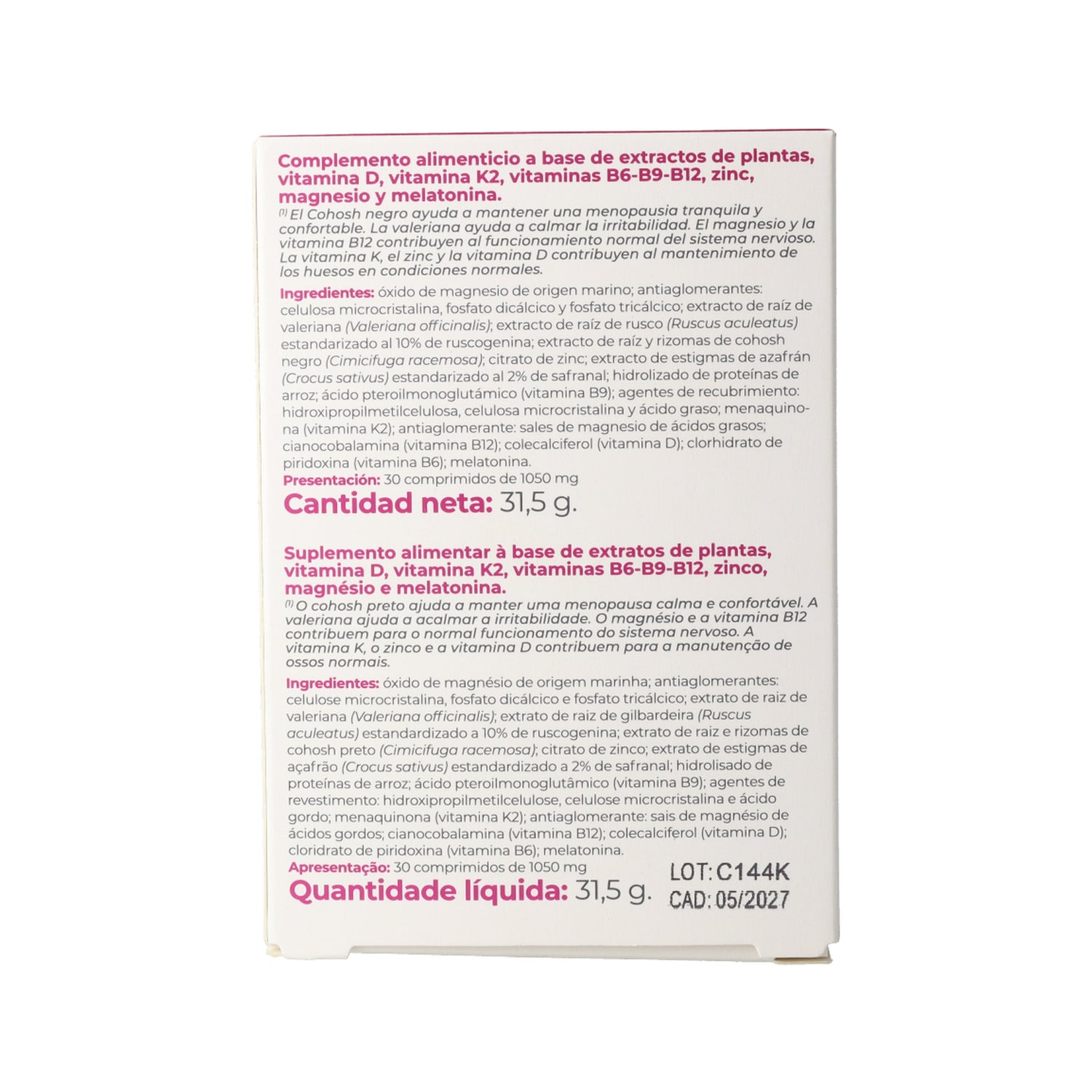 Contiene cohosh negro, valeriana, magnesio, vitamina B12, vitamina K, zinc y vitamina D.