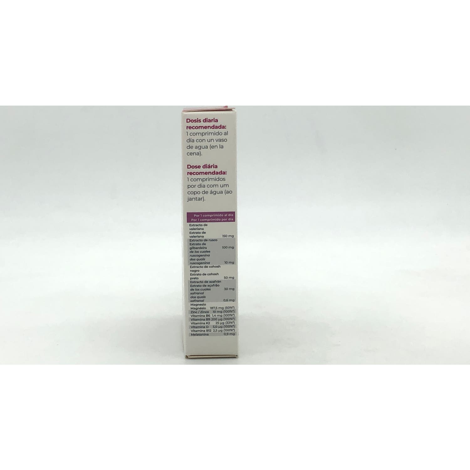 Análisis Nutricional para 1 comprimido: Extracto de valeriana: 150 mg Extracto de rusco: 100 mg del cual ruscogenina: 10 mg Extracto de cimífuga: 50 mg Extracto de azafrán: 30 mg del cual safranal : 0.6 mg Magnesio: 187.5 mg (50%*) Zinc: 10 mg (100%*) Vitamina B6: 1.4 mg (100%*) Vitamina B9 - Ácido fólico: 200 µg (100%) Vitamina K2: 25 µg (33%) Vitamina D: 5 µg (100%) Vitamina B12: 2.5 µg (100%) Melatonina: 0.9 mg