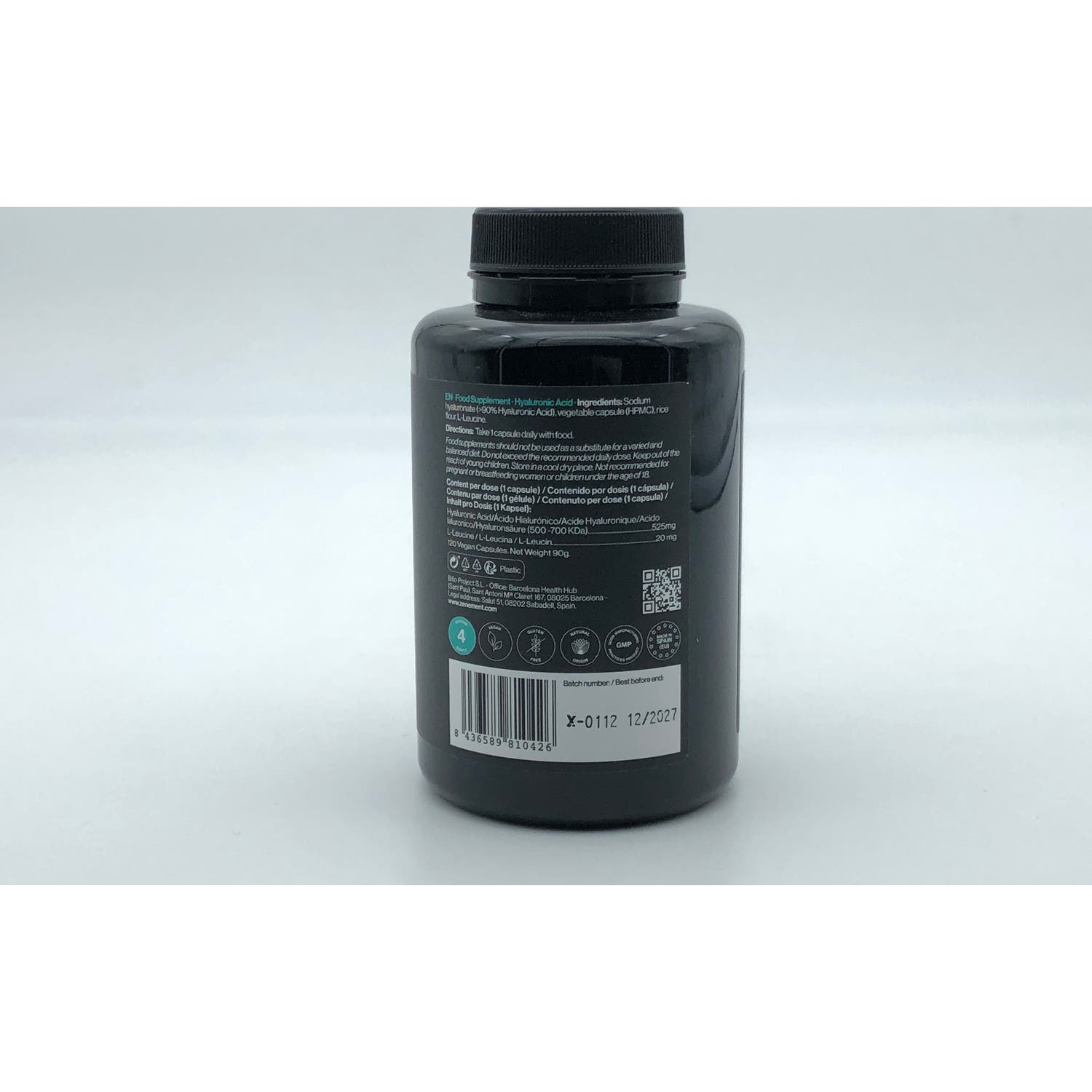 Ingredientes por cápsula: Hialuronato sódico (>90% Ácido Hialurónico PM 500-700 KDa) 583,34 mg, L-Leucina 20 mg. Otros ingredientes: harina de arroz, cápsula vegetal (HPMC).