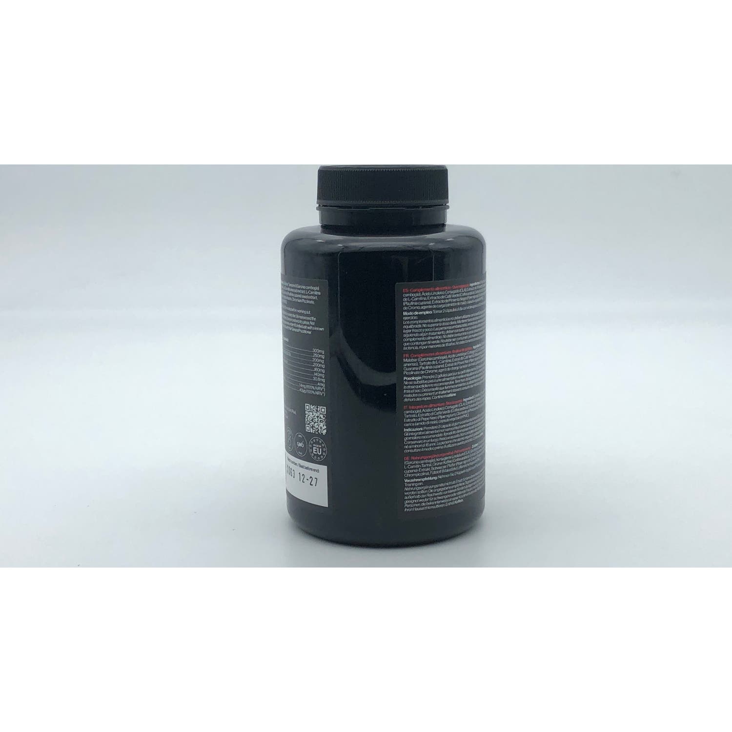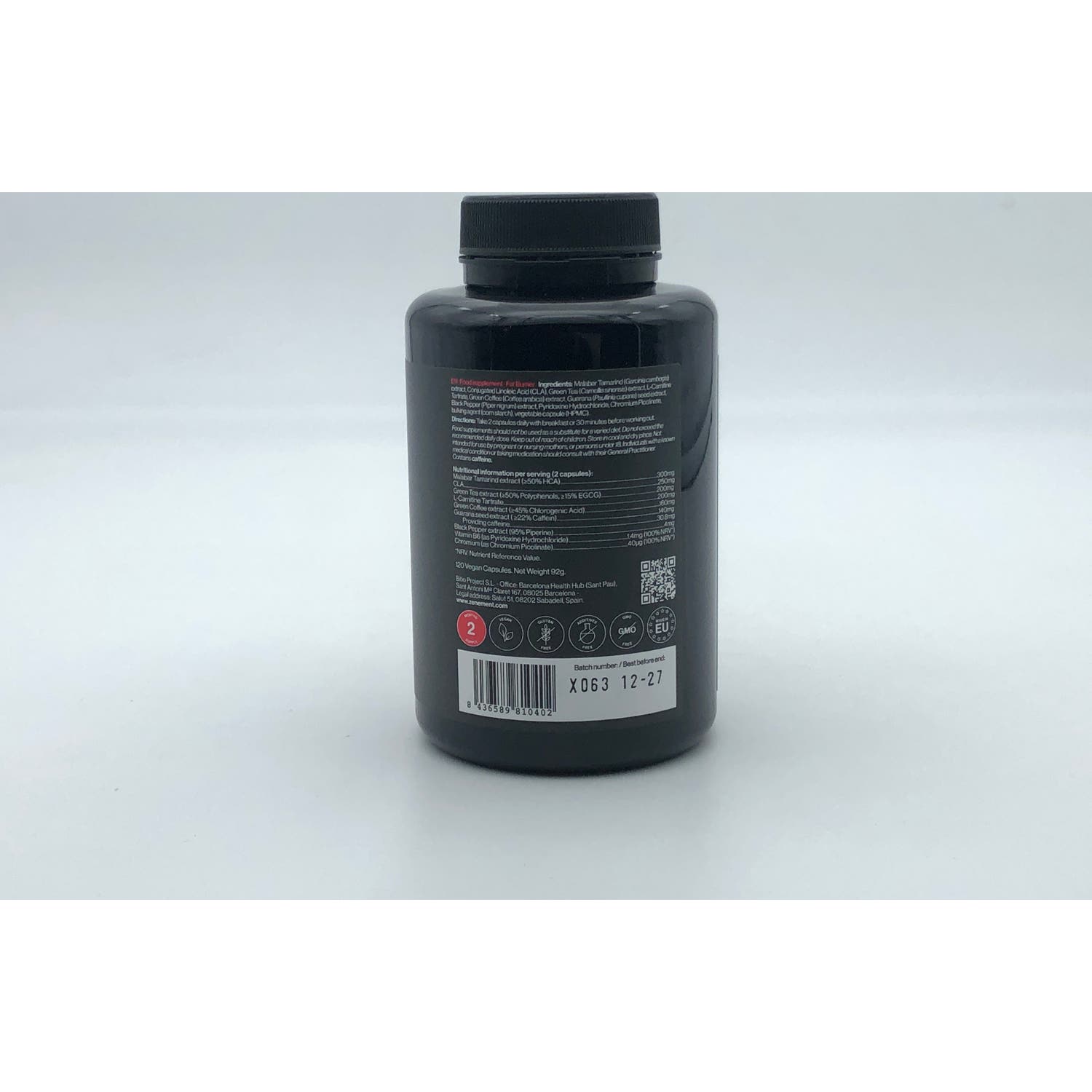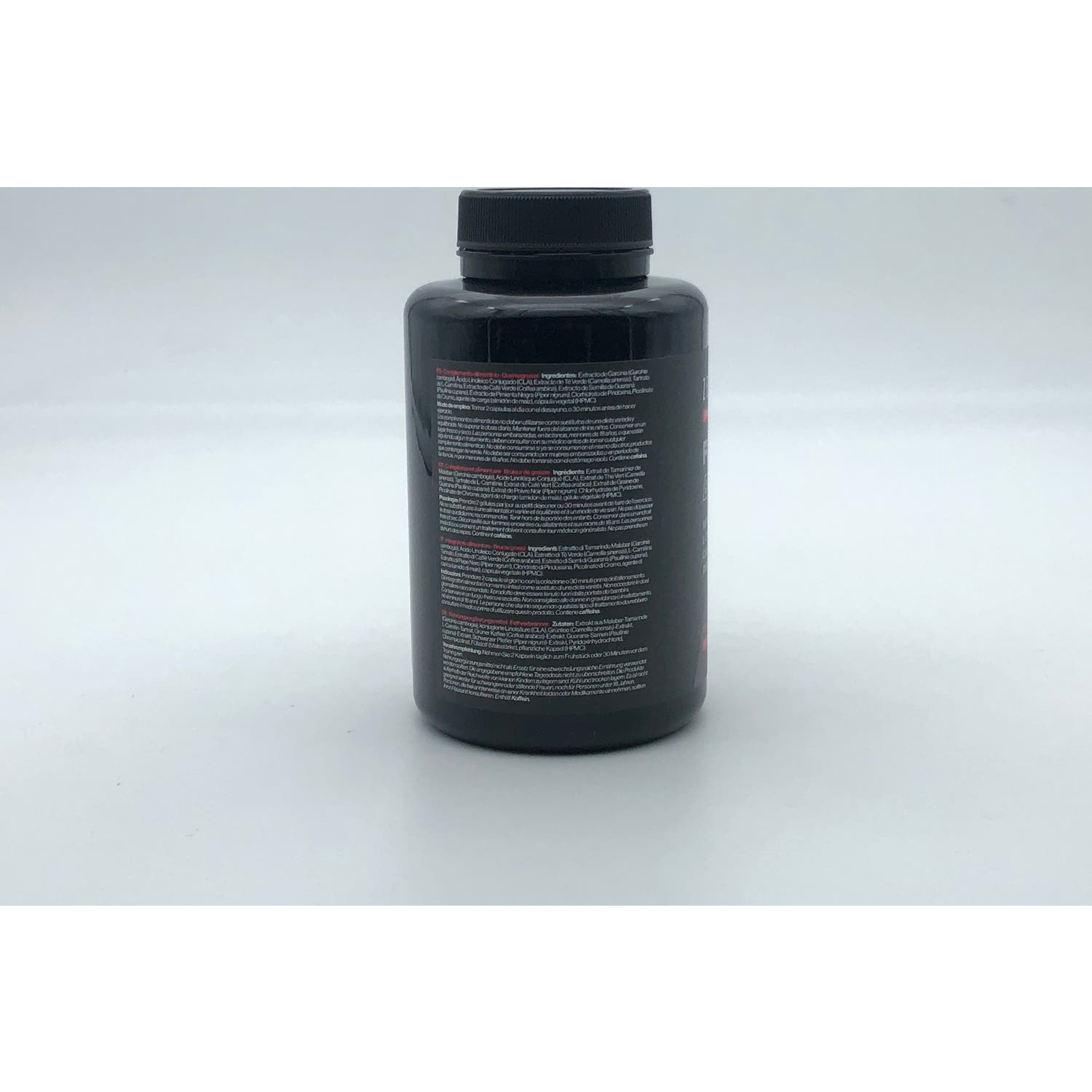 Ingredientes por dosis (2 cápsulas): Extracto de Té Verde (de Camellia sinensis, ≥50% Polifenoles, ≥15% EGCG) 200 mg, L-Carnitina Tartrato 200 mg, Extracto de Garcinia cambogia (≥50% HCA) 300 mg, Ácido Linoleico Conjugado (CLA) 250mg, Extracto de Café Verde (de Coffea arabica, ≥45% Ácido Clorogénico) 160 mg, Extracto de semilla de Guaraná (de Paullinia cupana, ≥22% Caffein) 140 mg, Extracto de Pimienta Negra (de Piper nigrum, 95% Piperine) 4 mg, Cromo (como Picolinato de Cromo) 40 µg (100% VRN*), Vitamina B6 (como Clorhidrato de Piridoxina) 1,4 mg (100% VRN*). Otros ingredientes: agente de carga (almidón de maíz), cápsula vegetal (HPMC). *VRN: Valores de Referencia de Nutrientes.
