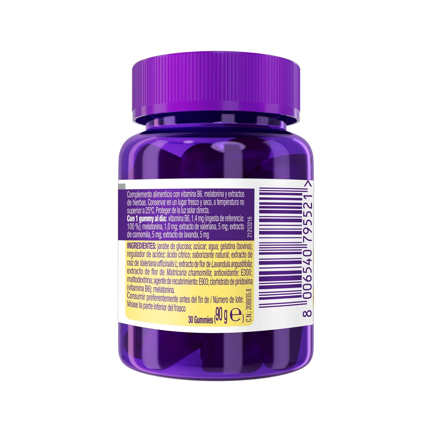 Complemento alimenticio en gominolas a base de melatonina, camomila, lavanda y valeriana. Favorece la conciliación del sueño y la calidad del descanso, gracias a las propiedades calmantes y relajantes de sus ingredientes. Cuenta con un delicioso sabor frutal a mango y plátano. Indicado para adultos.