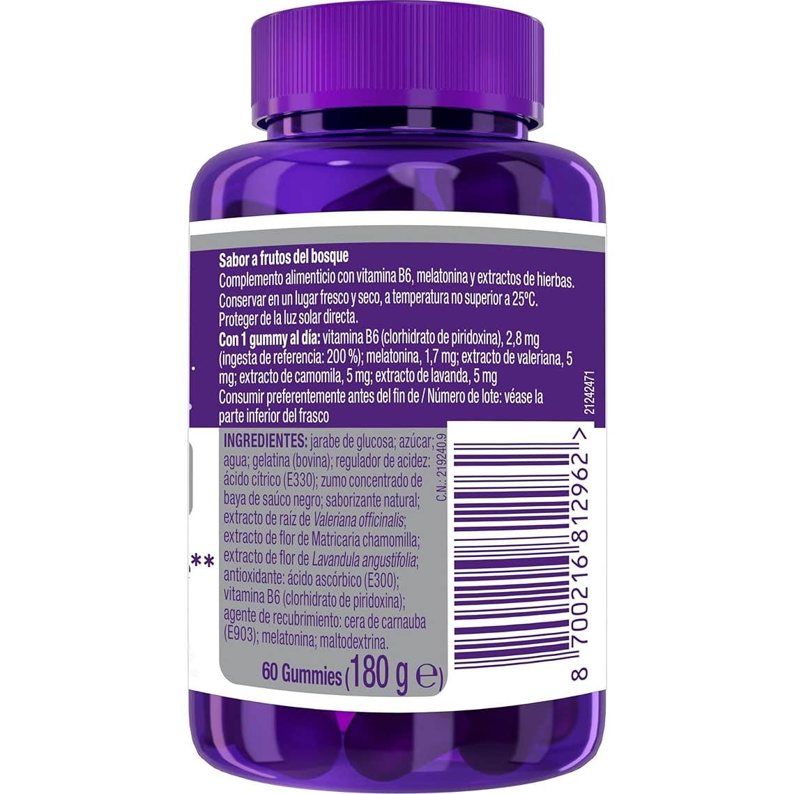 Sus activos aportan diferentes beneficios: La Lavanda es una planta aromática que da soporte a relajar mente y cuerpo. La Manzanilla tiene propiedades sedantes y ayuda a mejorar el sueño y el descanso. La Valeriana mejora la calidad del sueño. La Vitamina B6 contribuye al correcto funcionamiento del sistema central y la Melatonina ayuda a reducir el tiempo para conciliar el sueño.