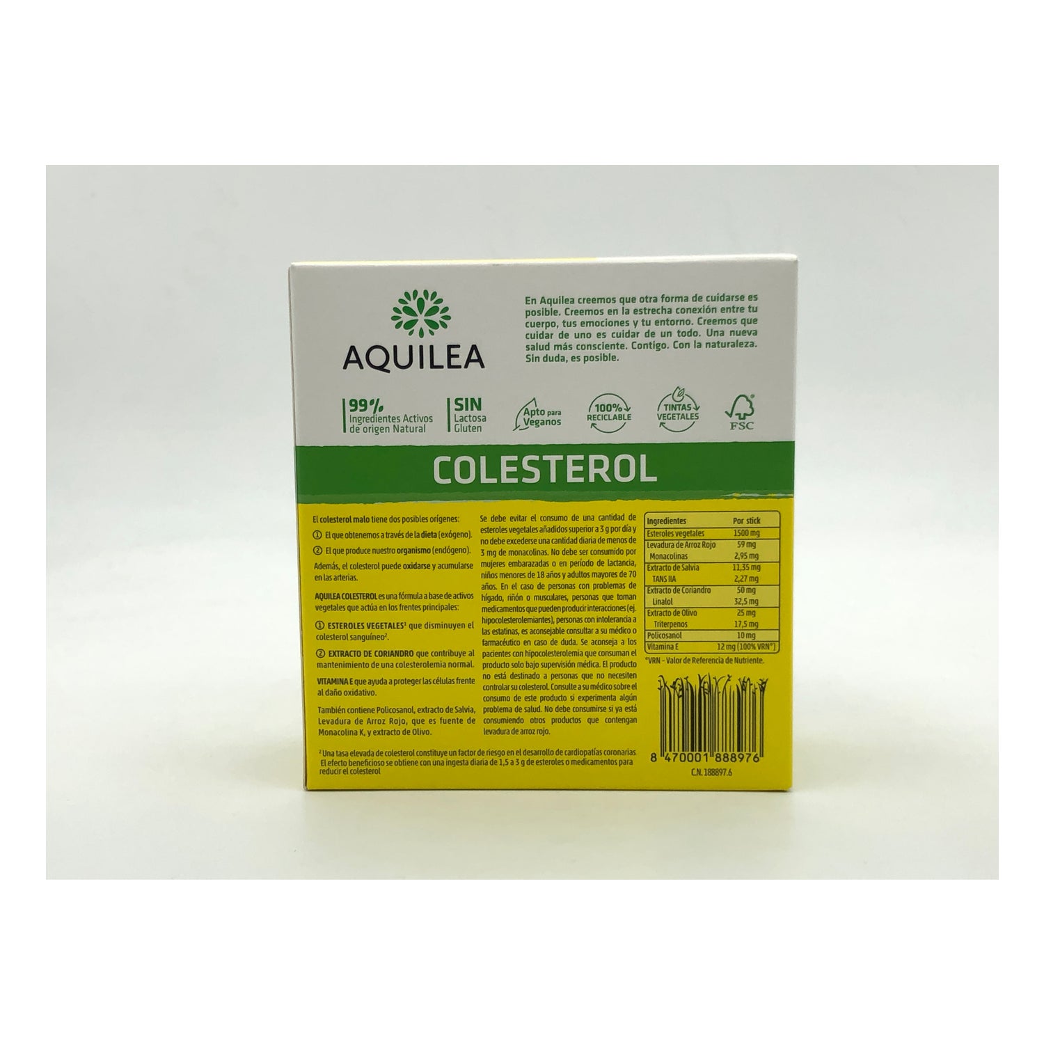 È composto da steroli vegetali che aiutano a ridurre il colesterolo esogeno. Inoltre, l'azione della Monacolina K, proveniente dal lievito di riso rosso, che facilita il controllo della sintesi endogena del colesterolo e della Vitamina E che protegge dal danno ossidativo.