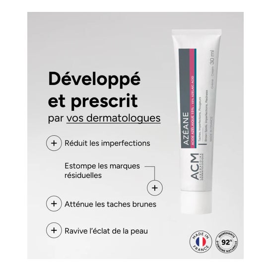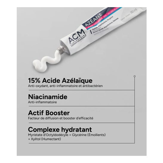 Acm Azéane Crema Acido Azelaico 15% 30ml è una crema che contiene un 15% di acido azelaico che aiuta a migliorare l'aspetto generale della pelle, unificando il tono e la texture. Inoltre, facilita anche la riduzione delle macchie iperpigmentate e aiuta a ridurre le imperfezioni. Contiene 30ml.