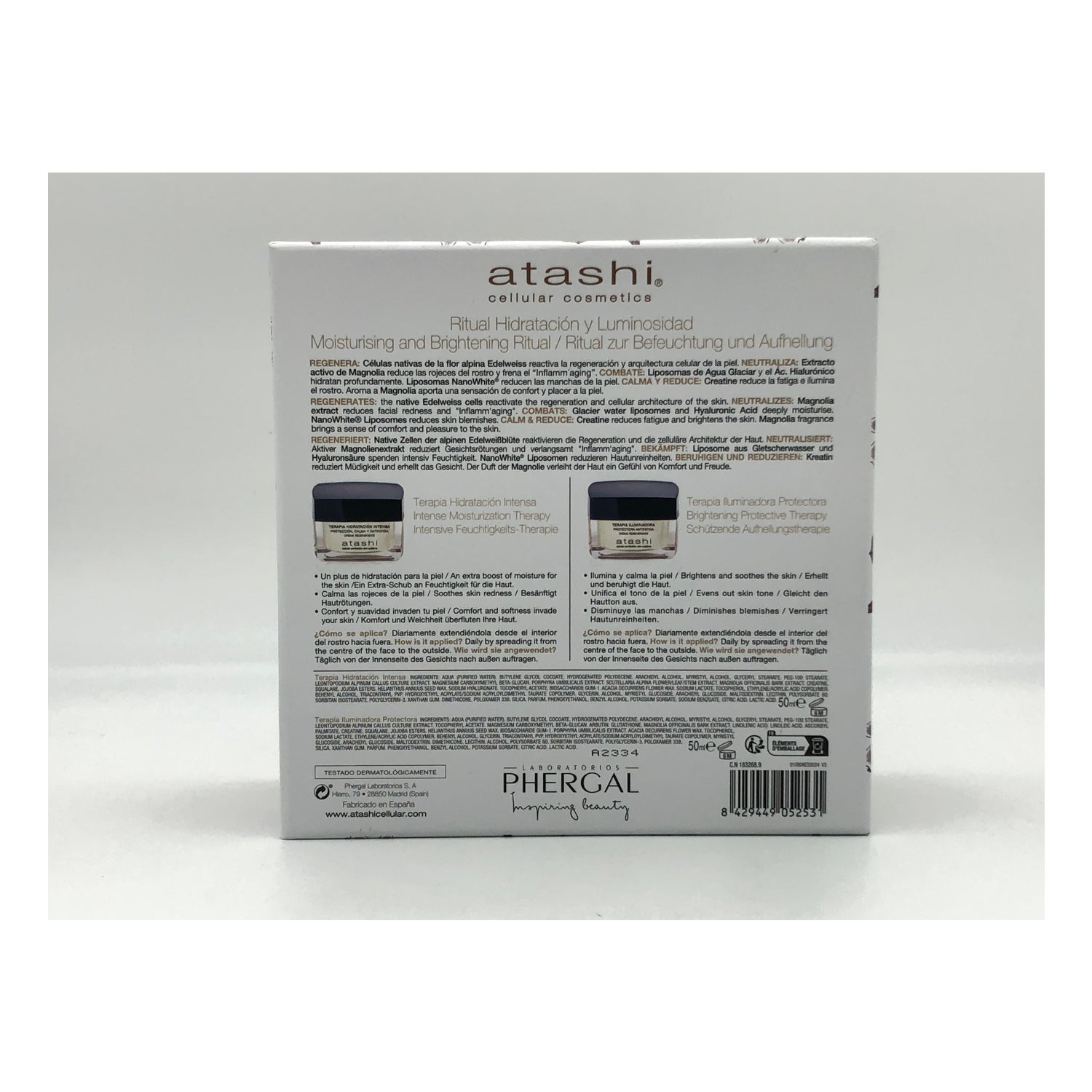 Atashi® Illuminating Therapy + Intense Hydration Chest è uno scrigno per la cura del viso che comprende due prodotti che contribuiscono a donare luminosità all'incarnato e maggiore compattezza. Da un lato, comprende la Crema Terapia Protettiva Illuminante Anti-Fatica, una crema dall'effetto rigenerante che previene la perdita di elasticità e compattezza della pelle del viso. Combina il fiore alpino della stella alpina con l'estratto di magnolia per ottenere un effetto lifting e neutralizzare i radicali liberi e il rossore dell'incarnato.