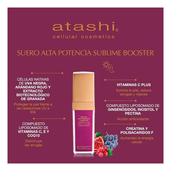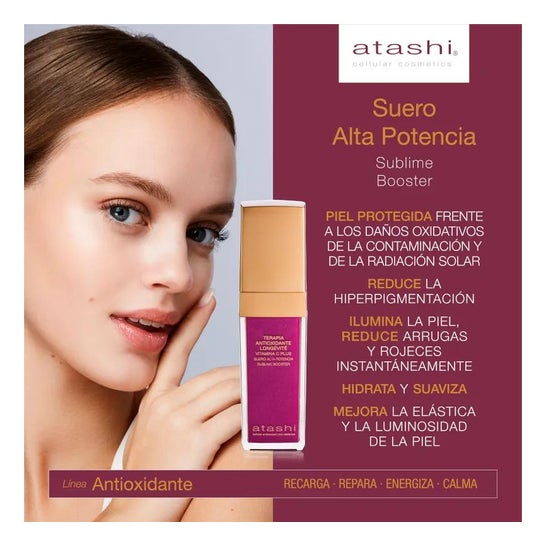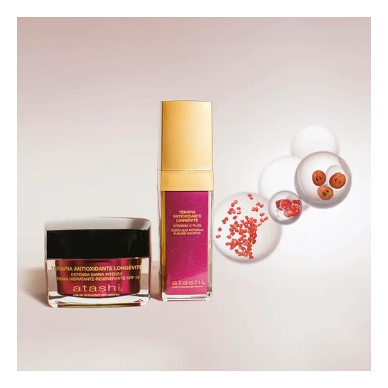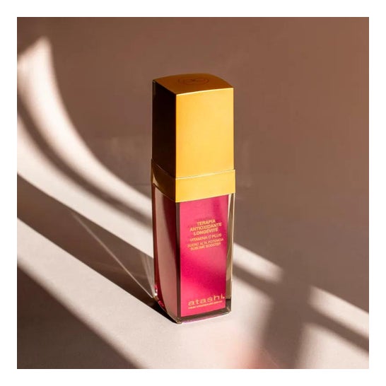 Atashi® Antioxidant Therapy Longévité Serum Booster Vitamina C Plus 30ml è un trattamento antiossidante concentrato con polifenoli della miscela di cellule staminali vegetali della Borgogna e del Mirtillo Nero d'Uva e dell'Estratto Biotecnologico di Melograno. Tutti questi hanno proprietà antiossidanti, che neutralizzano i danni prodotti dai radicali liberi. Inoltre, sono in grado di formare uno strato che aiuta a rallentare l'invecchiamento e a ripristinare i danni prodotti dalla radiazione solare e dall'inquinamento.