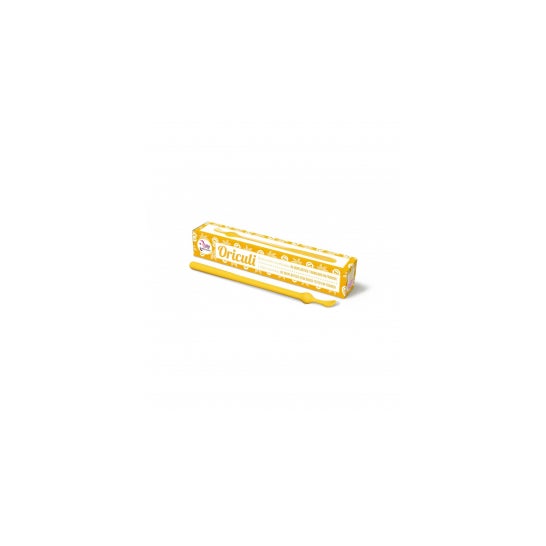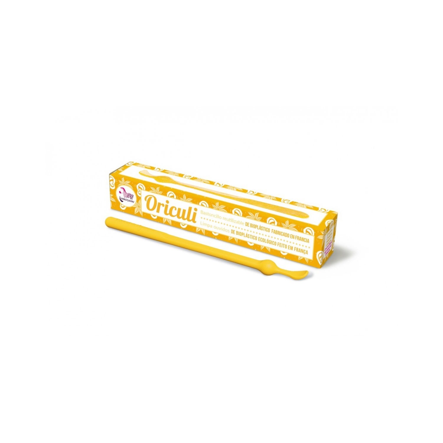 Bastoncino riutilizzabile giallo per l'orecchio Oriculi di Lamazuna. È realizzato al 100% in bioplastica ecologica e molto resistente. Aiuta a prevenire la formazione di tappi di cerume. È più economico e sostenibile. Usalo per rimuovere il cerume visibile. Senza sprechi. Cruelty free. Vegano.