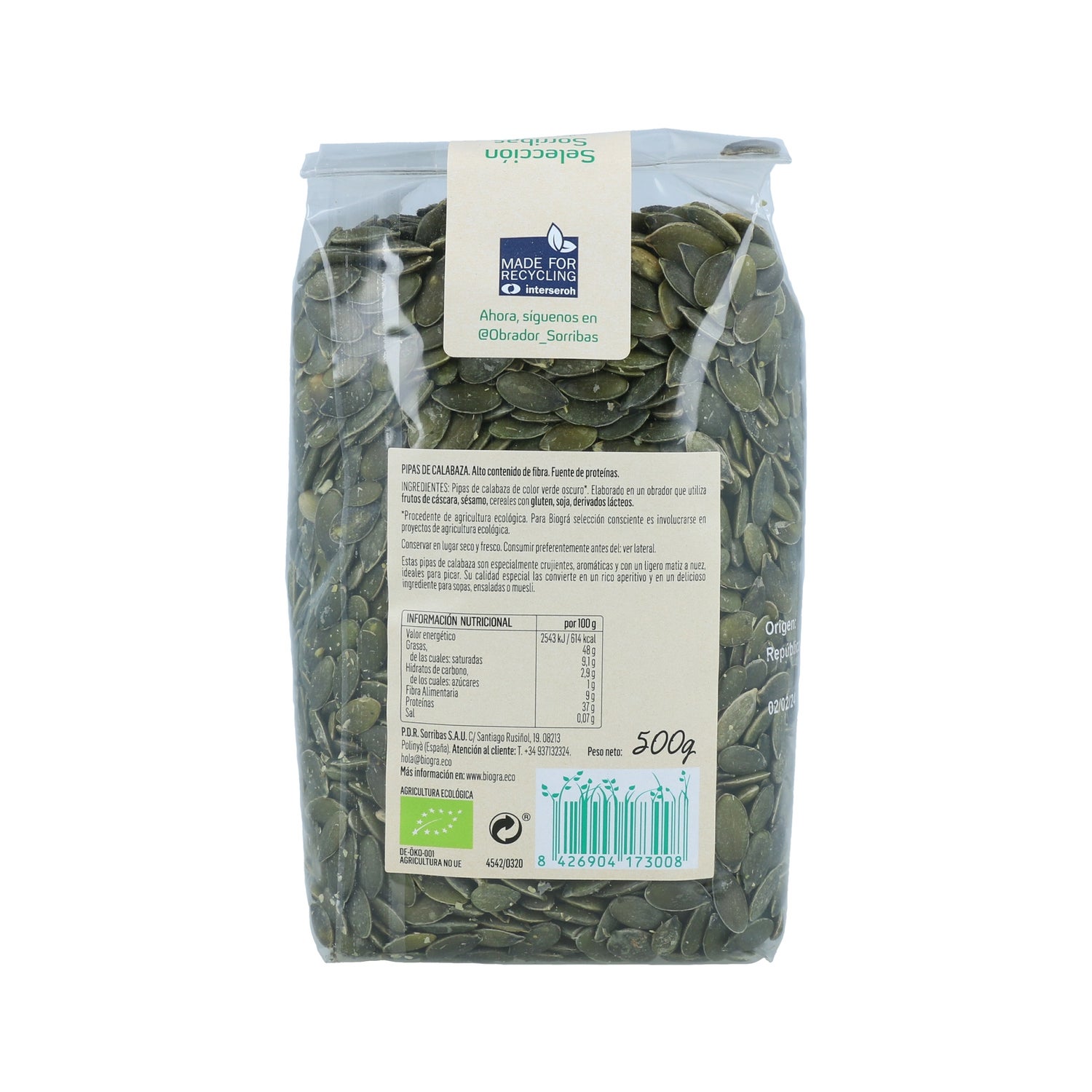 Semi di zucca Biogra Pipas Bio 500g semi di zucca pronti da mangiare, da agricoltura biologica. sono una fonte di acidi grassi sani e proteine di alto valore biologico. favoriscono il processo digestivo e la salute della flora intestinale. contengono fitosteroli, magnesio, zinco e acidi grassi omega 3, che contribuiscono a mantenere e proteggere la salute cardiovascolare. consigliato per l'uso con cereali, insalate, riso, salse e piatti preparati. prodotto certificato.