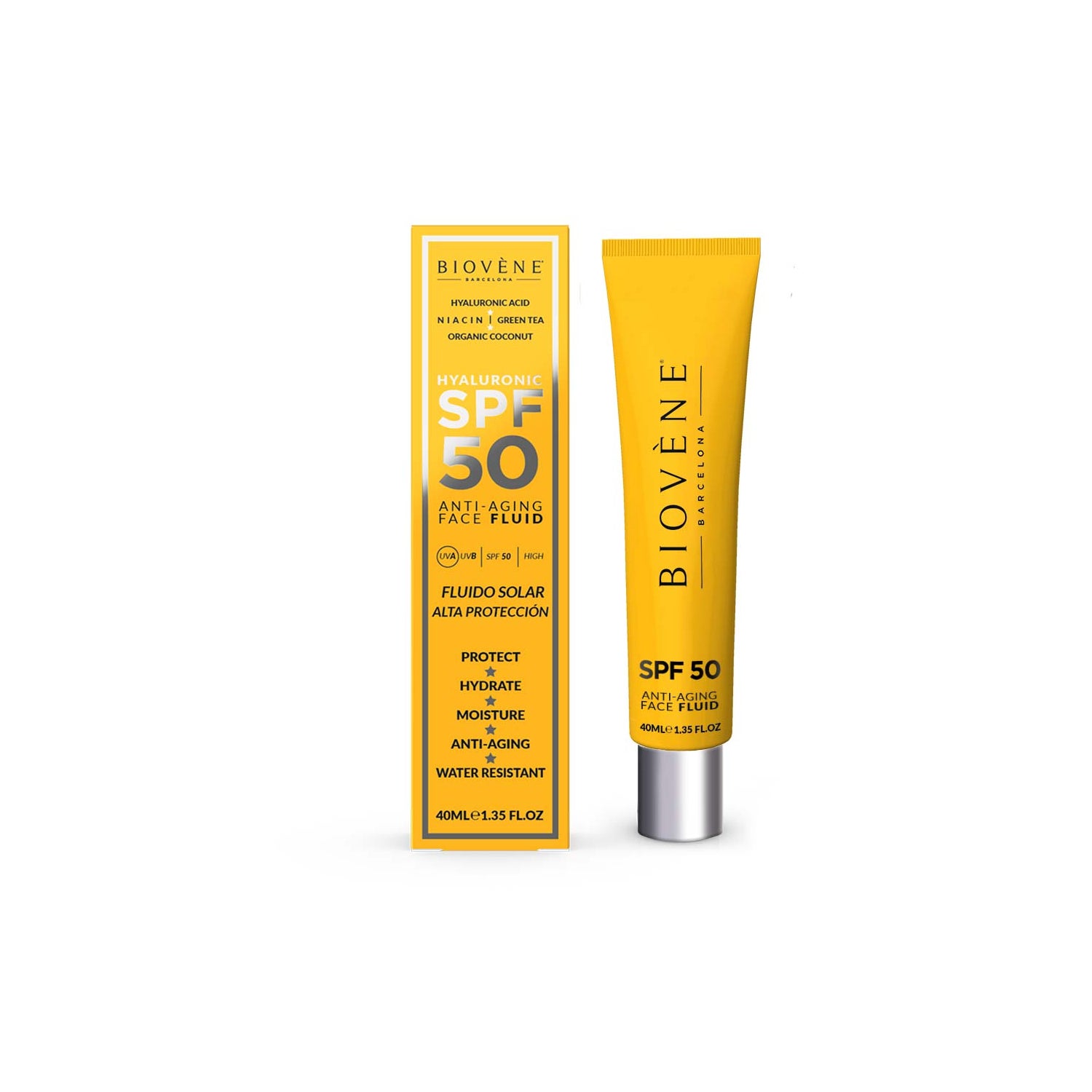 Biovène Hyaluronic Spf50 Anti-Aging Face Fluid 40ml è un fluido facciale di protezione solare progettato per offrire un'alta difesa contro il foto-invecchiamento. Questo prodotto, ideale per le calde giornate estive, presenta una formula leggera che si assorbe rapidamente nella pelle.