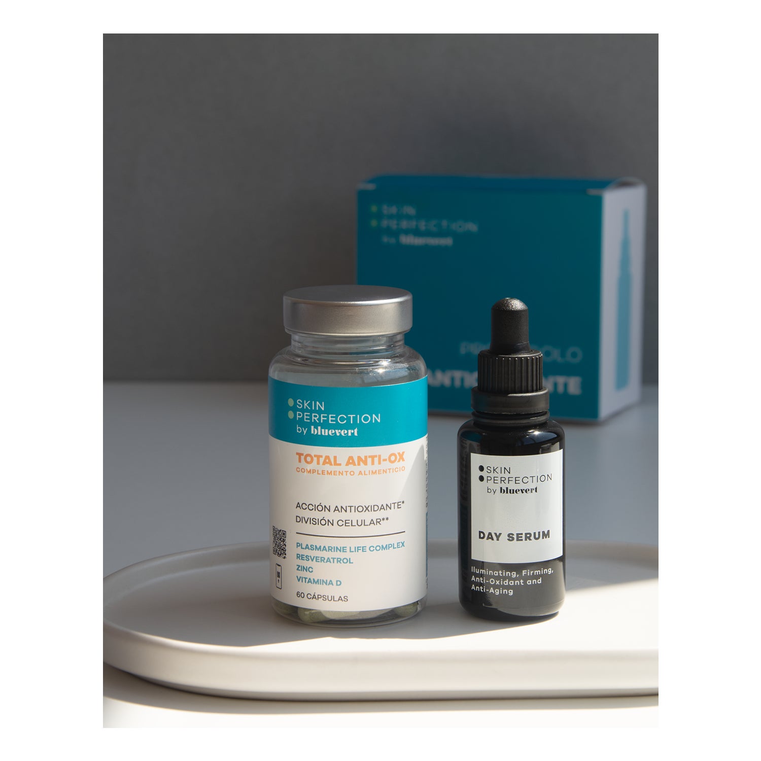 Bluevert Skin Perfection Pack Protocollo Antiossidante è un set di cura del viso anti-invecchiamento che combina la potenza antiossidante più avanzata sotto forma di siero con un esclusivo integratore alimentare per proteggere e rivitalizzare le cellule dall'interno. La sua formula, arricchita con microalghe marine e un'alta concentrazione di antiossidanti naturali, aiuta a fermare i segni dell'invecchiamento, migliorare la salute generale e potenziare l'effetto dei trattamenti cosmetici.