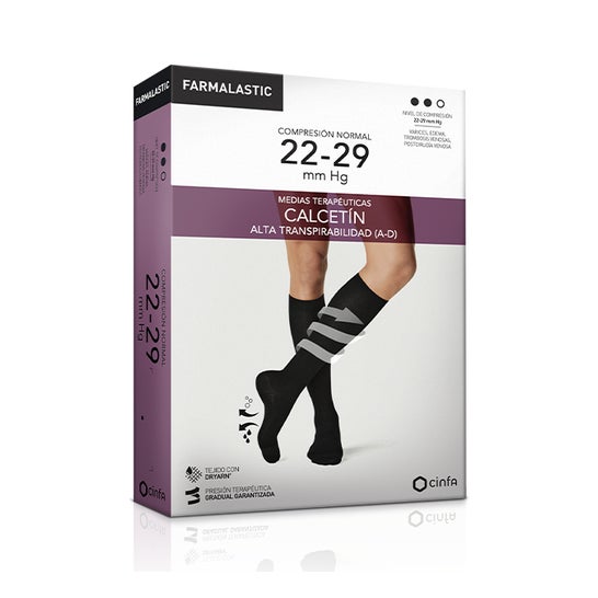 Farmalastic ha sviluppato la calza antibatterica (A-D). Questa calza a compressione normale antibatterica di Farmalastic esercita sulla gamba un leggero massaggio verso l'alto esercitando una pressione maggiore sulla caviglia e minore sulla parte superiore, facilitando così la circolazione venosa. Questo prodotto ha il piede lavorato a maglia con filo d'argento per prevenire odori e batteri.