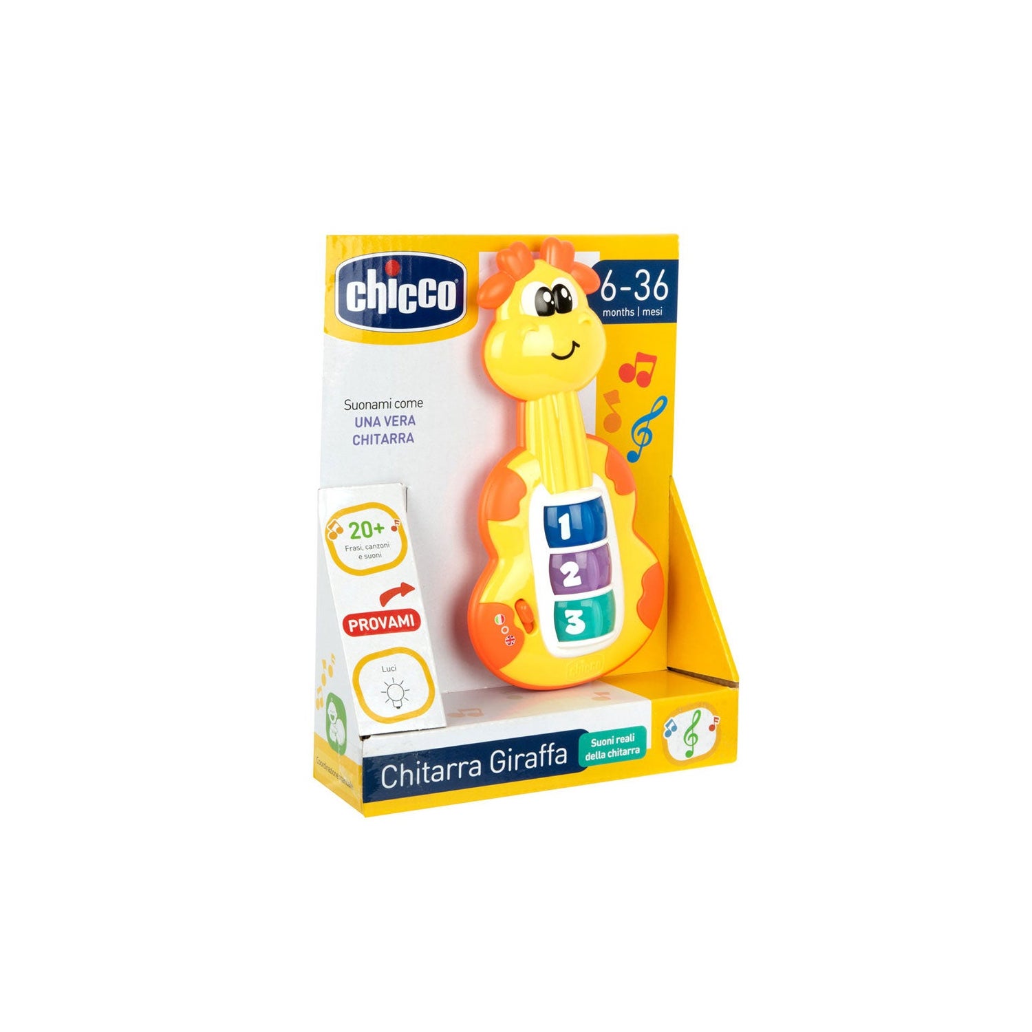 Chitarra interattiva con un simpatico design a forma di giraffa e 6 pulsanti con varie funzioni luminose e sonore. Contribuisce al divertimento e all'apprendimento dei più piccoli e favorisce lo sviluppo del linguaggio. È un giocattolo leggero e semplice, ideale per i bambini a partire dai 6 mesi.
