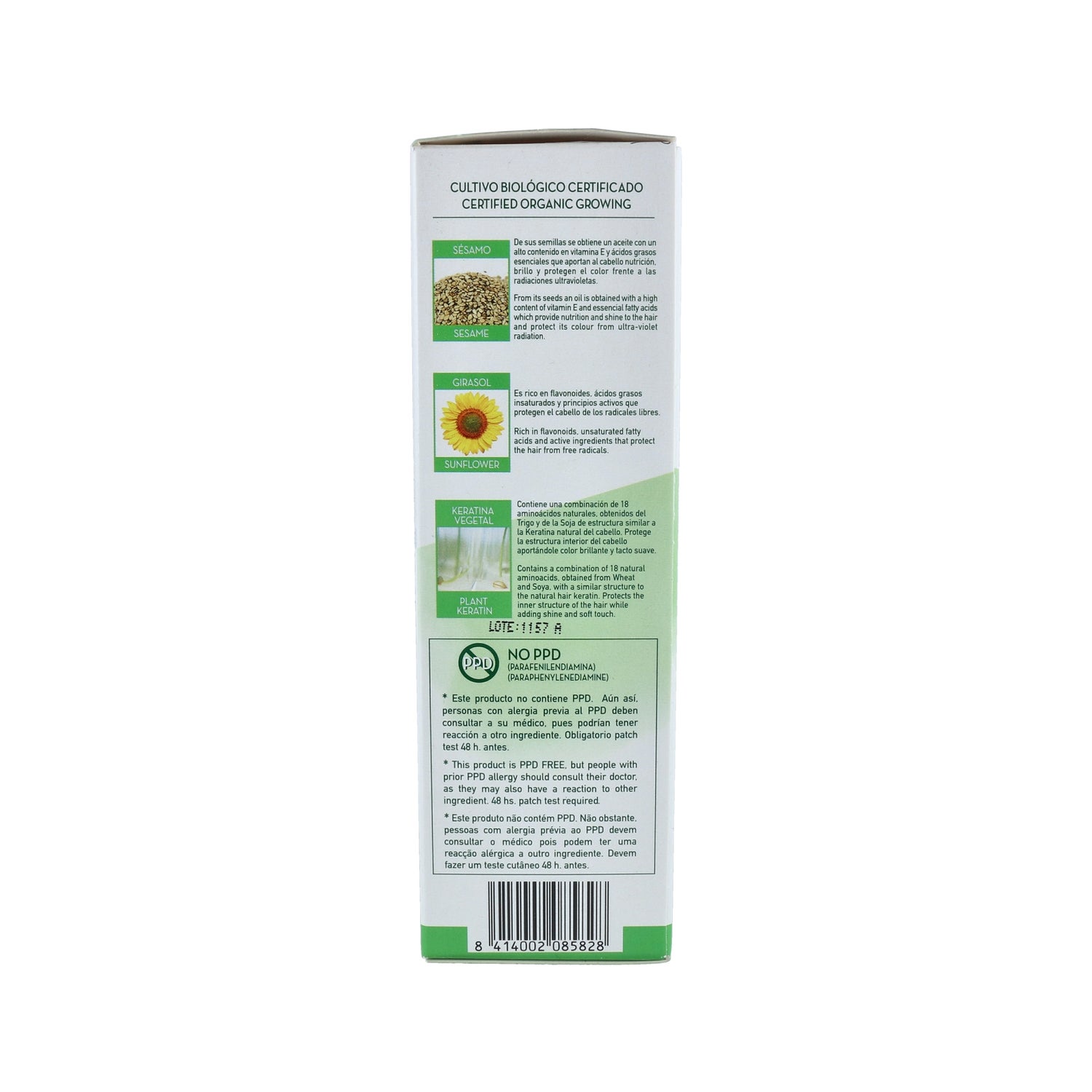 Colorazione permanente arricchita con olio di Sesamo di coltivazione biologica certificata, estratto di Girasole e Cheratina vegetale, che forniscono ai capelli una colorazione permanente con un colore intenso, luminoso e duraturo. Fornisce una colorazione duratura e protezione dei capelli.