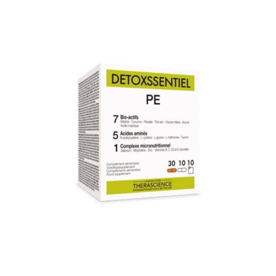 Detoxssentiel PE 30+10+10 capsule dei Laboratori Therascience è un integratore naturale che aiuta l'organismo a disintossicarsi dagli interferenti endocrini che ci circondano.Grazie a un complesso sinergico composto da 7 bioattivi (betaina, curcuessentiel, pilosella, tè verde, carbone vegetale, broccoli, acido alfa-lipoico), 5 aminoacidi (N-acetilcisteina, L-cisteina, L-glicina, L-metionina, taurina), 1 complesso micronutrizionale (selenio, molibdeno, zinco, vitamine naturali B, C, D3 ed E), Detoxssentiel PE XS aiuta a ripristinare l'attività ormonale.Solo per gli adulti e non è raccomandato per gli adolescenti, le donne in gravidanza e in allattamento, i diabetici o le persone che assumono contemporaneamente anticoagulanti. Le persone che assumono farmaci devono utilizzare il prodotto solo sotto controllo medico. Capsule 100% vegetali con aroma naturale di limone.Gli integratori alimentari devono essere utilizzati nell'ambito di uno stile di vita sano e non in sostituzione di una dieta varia ed equilibrata.